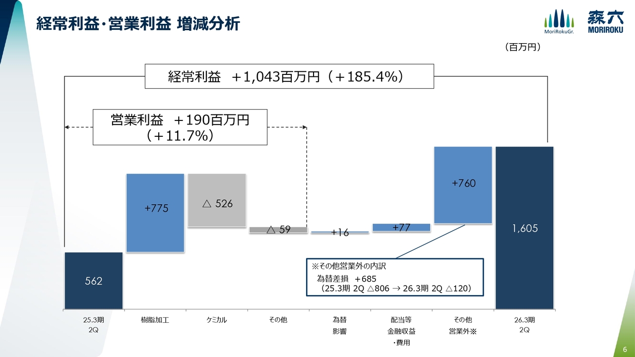 連結の利益増減分析です。営業利益は、ケミカル事業で減益となったものの、樹脂加工製品事業の増益でカバーし、トータルで1億9,000万円の増益となりました。また、為替差損の縮小により、経常利益も10億円の増益となりました。