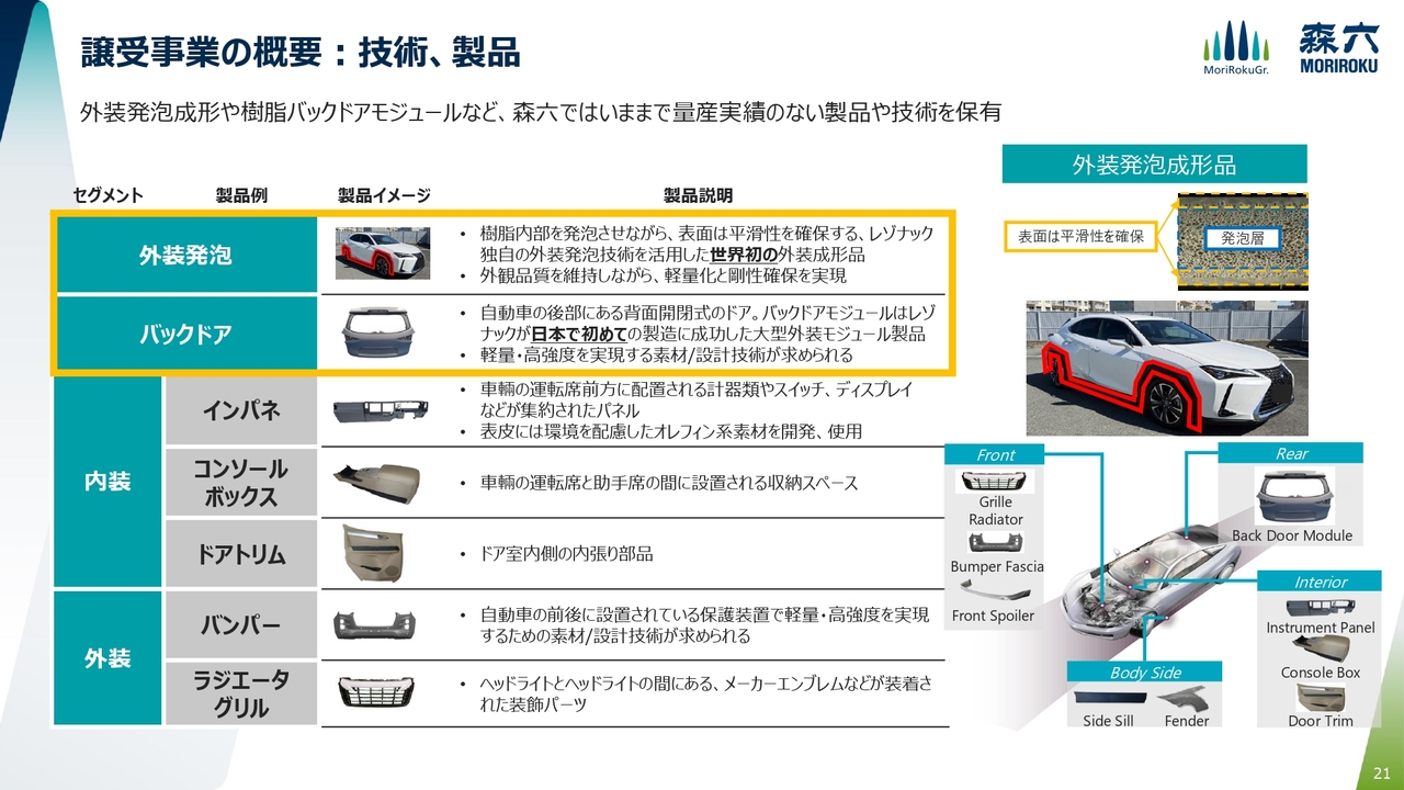 譲受事業の特徴は、森六ではこれまで量産実績のない技術や製品を持つ点です。その代表例が外装発泡成形技術です。樹脂の内部を発泡させながら表面の平滑性を確保する独自技術であり、部品の軽量化に大きく貢献するものです。