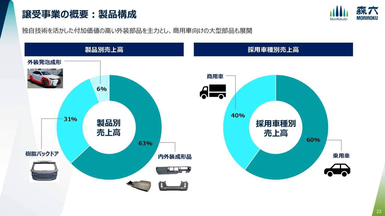 売上高の内訳です。独自技術を背景に、付加価値の高い外装部品の比率が高いことが特徴です。当社の樹脂加工製品事業では乗用車のみが対象ですが、譲受事業では商用車の内外装部品も手がけています。