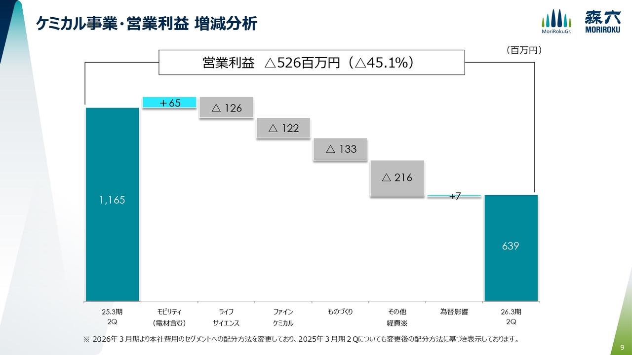 ケミカル事業の営業利益分析です。電機・電子分野や国内の四輪・二輪向けが堅調に推移し、モビリティ分野全体では増益となりました。一方で、中国の自動車市場の落ち込みにより、自動車向け原材料や機能素材、塗料原料など幅広い分野で販売減少となりました。
