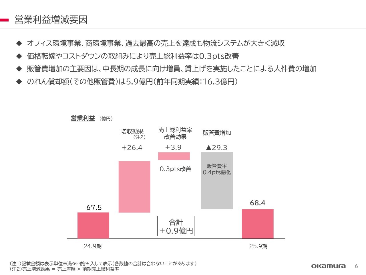 売上高については、オフィス環境事業および商環境事業で過去最高の売上を達成しましたが、物流システム事業は大きく減少しました。また、価格転嫁およびコストダウンの取り組みにより、売上総利益率は0.3パーセント改善しています。