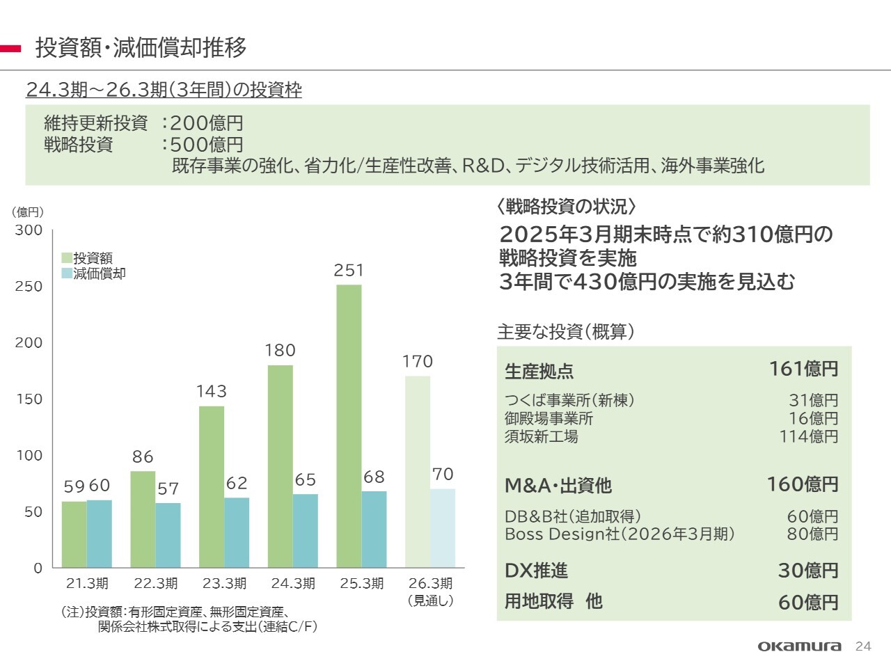 投資額・減価償却推移です。維持更新投資は予定どおり進めています。大きな戦略投資については、スライド右下に記載しているとおり、生産拠点、M&A・出資、DX推進などがあります。