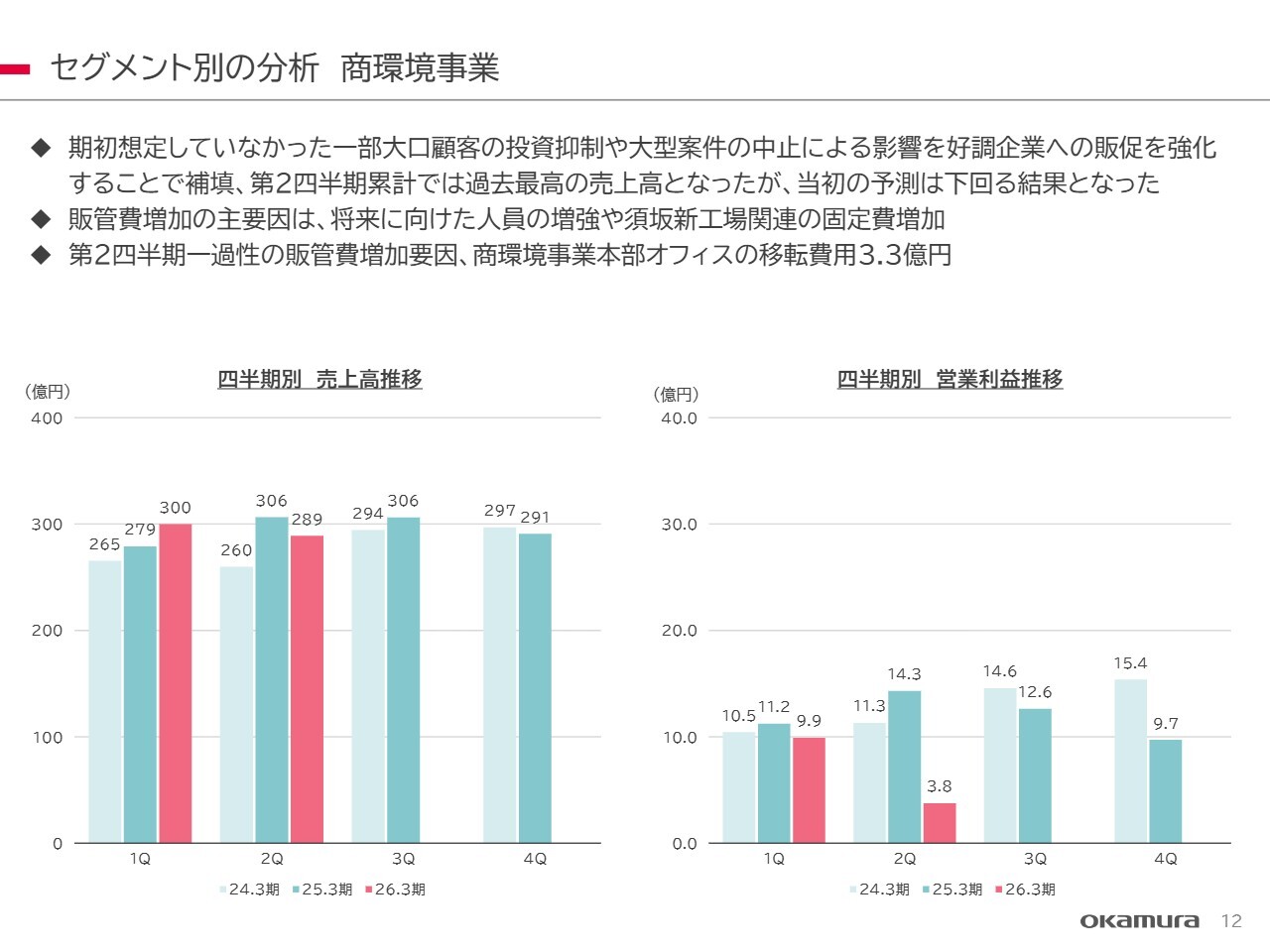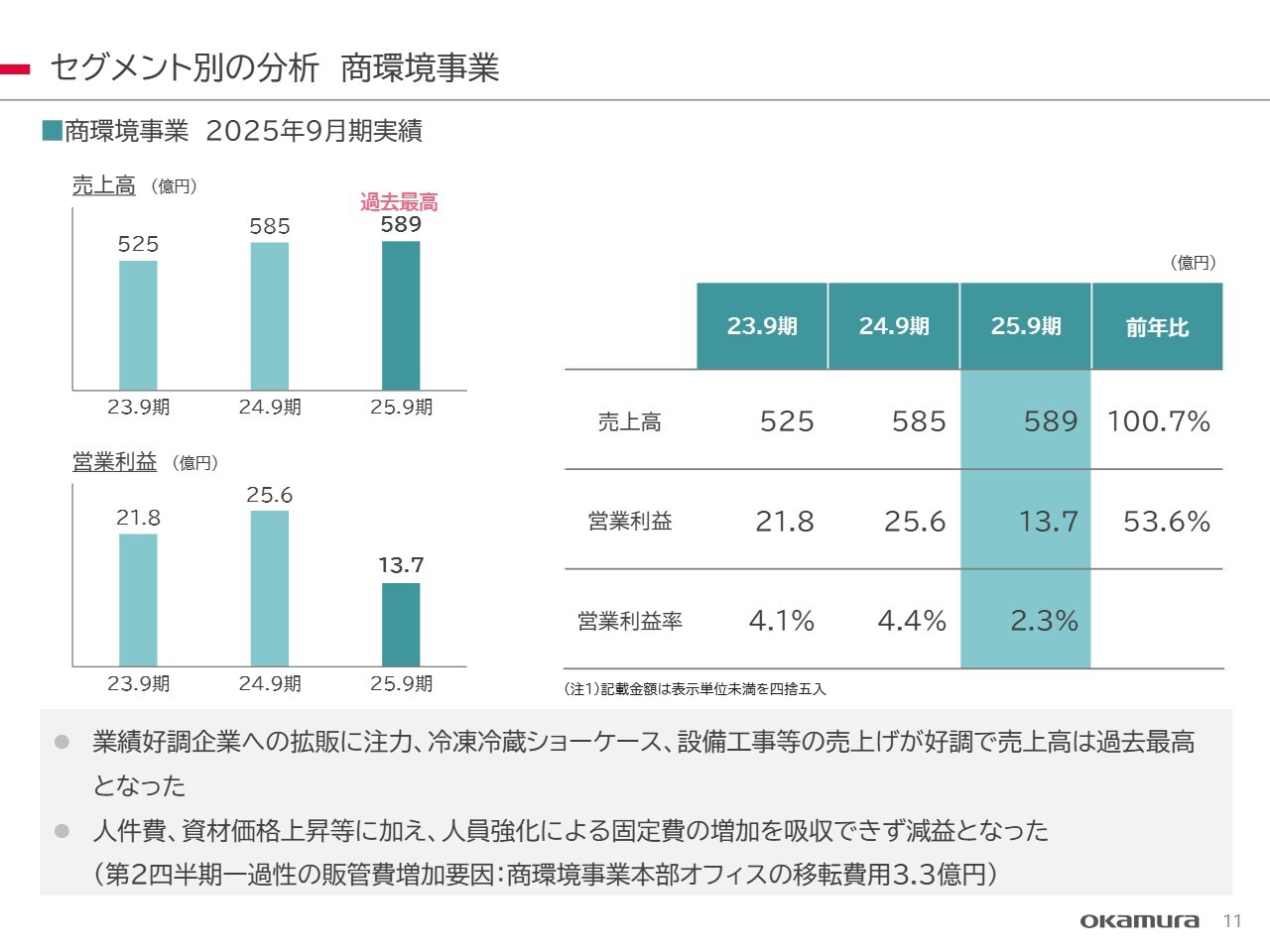 商環境事業についてです。売上高は589億円と過去最高を記録しましたが、営業利益は13億7,000万円と前年比で減益となりました。