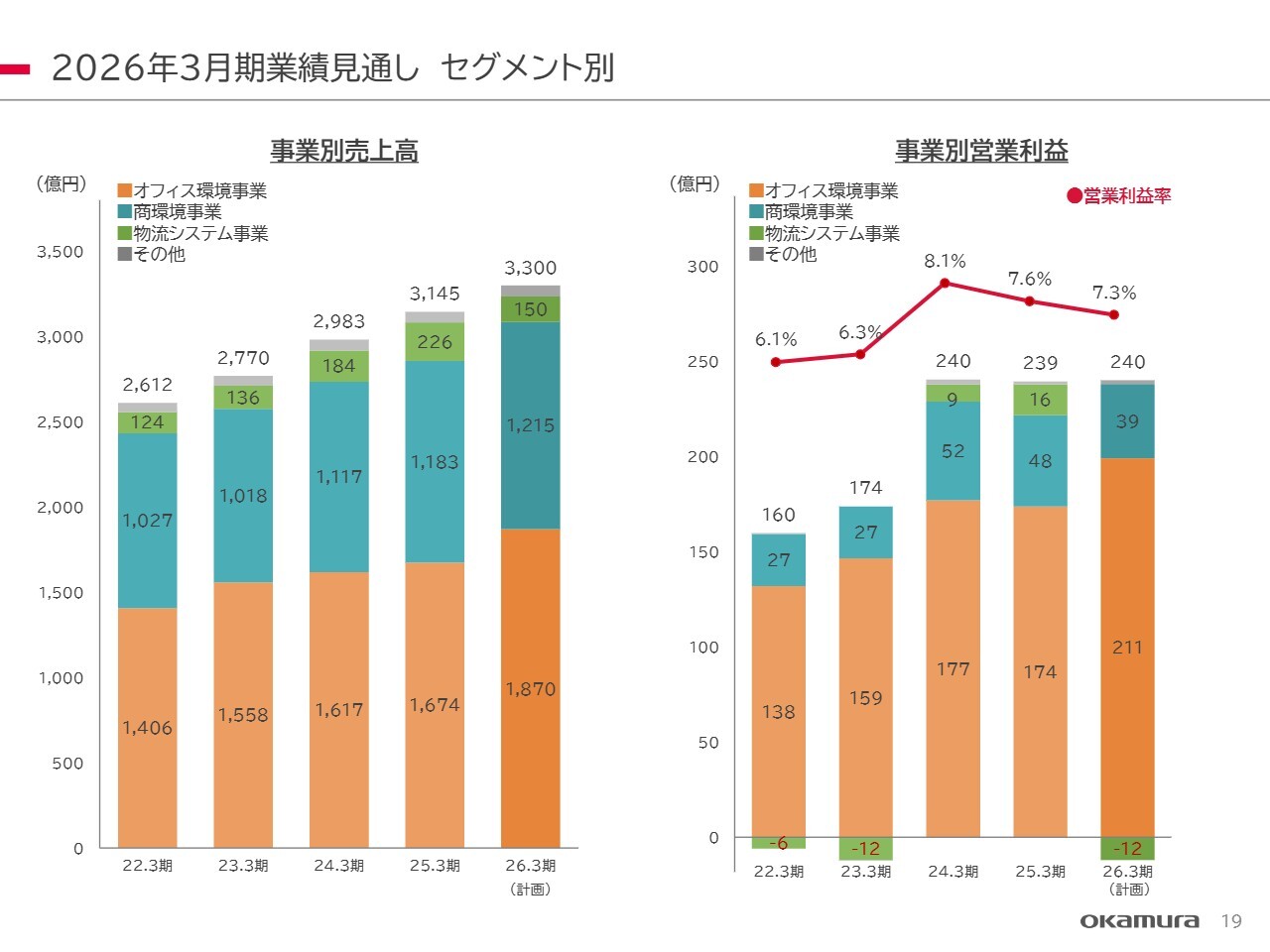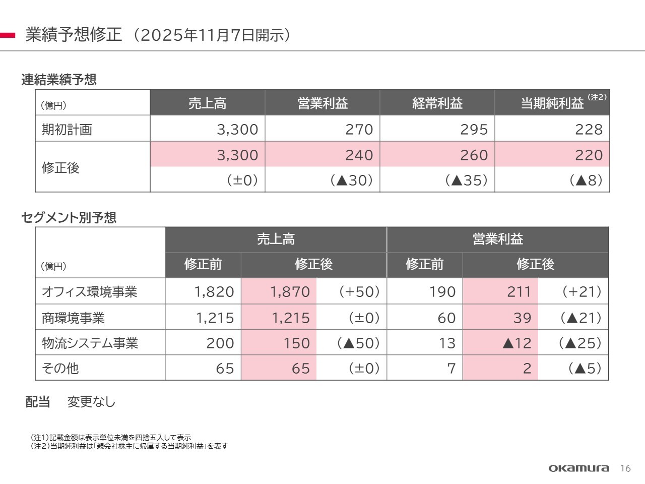 一方、商環境事業は売上高を据え置いていますが、営業利益を下方修正しています。物流システム事業は、売上高と営業利益の両方を下方修正しました。