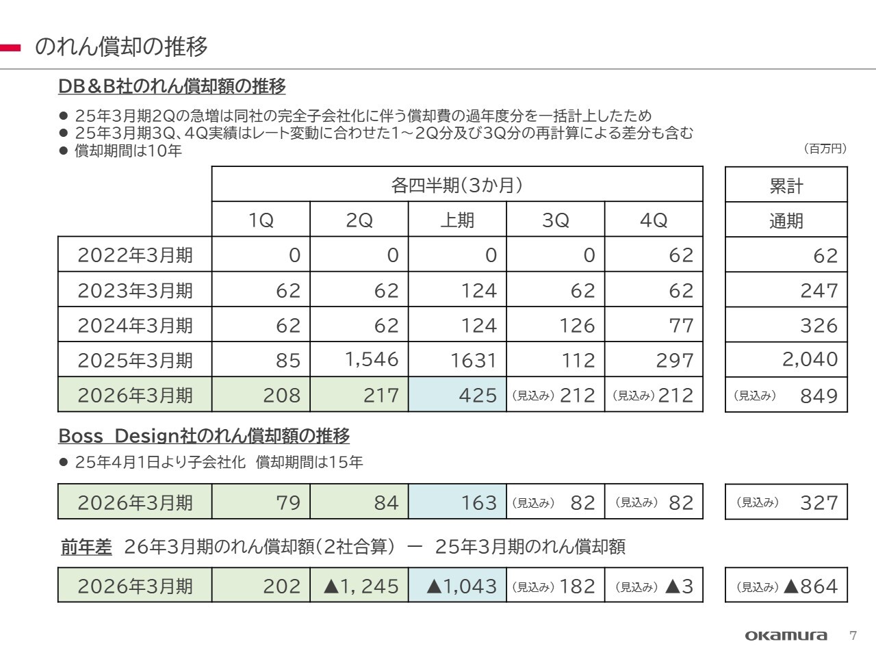のれん償却額の推移です。スライドの色が付いている部分が今上期に影響している部分です。DB&B社ののれん償却額は4億2,500万円、新たに買収したBoss Design社ののれん償却額は1億6,300万円です。