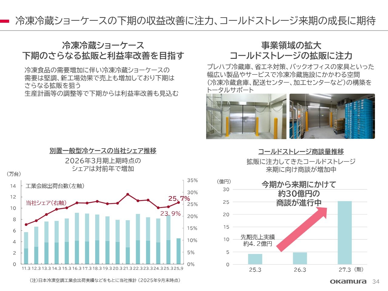 スライド右側には、先ほどお伝えしたコールドストレージの拡販に注力しているという内容を記載しています。2027年3月期にかけて現在約30億円の商談が進行中であり、今後徐々に増加する見込みです。