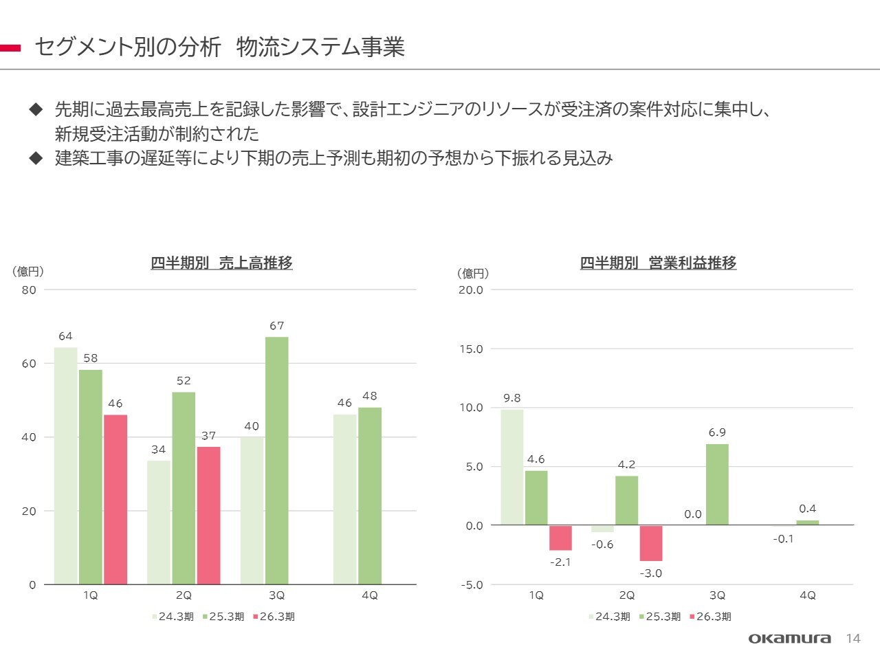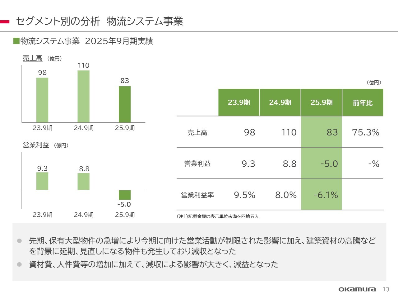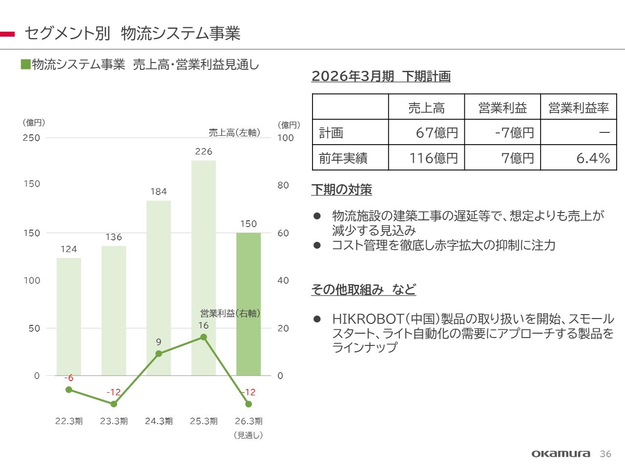 最後に、物流システム事業についてです。今期は受注残から見ると、売上高が150億円、営業利益が12億円の赤字になる見込みです。特に今期は物流施設の建築工事の遅れが発生し、期初の予定よりもさらに売上が減少する見込みです。コスト管理を徹底し、少しでも赤字を減らせるよう努力していきます。