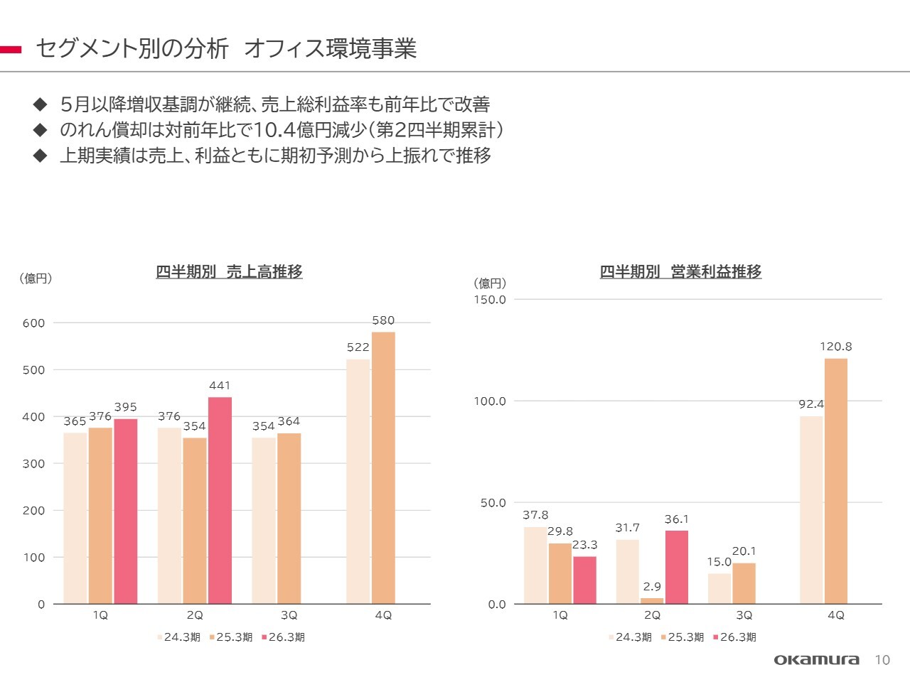 オフィス環境事業の最需要期である第4四半期、特に2月、3月の影響が大きく出ると見ています。特に3月の売上は平常時の2.2倍ほどとなるため、この期間にどれだけ利益を確保できるかが毎年の利益のポイントとなります。今期も前年を上回る利益の確保を目指しています。