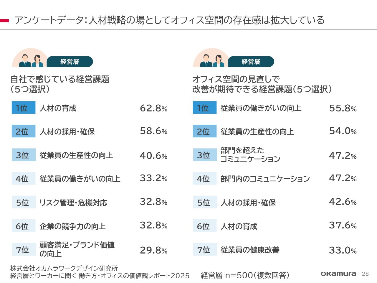 また、「オフィス空間の見直しで改善が期待できる経営課題」については、スライド右側に記載のとおり、従業員の働きがいの向上、従業員の生産性の向上、部門を超えたコミュニケーションがベスト3に挙げられています。