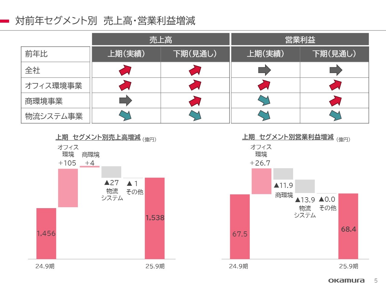 セグメントごとの対前年の上期・下期の実績と見通しを矢印で示しています。売上高に関しては、オフィス環境事業が上期・下期ともに好調に推移する見込みであり、営業利益も同様の傾向です。