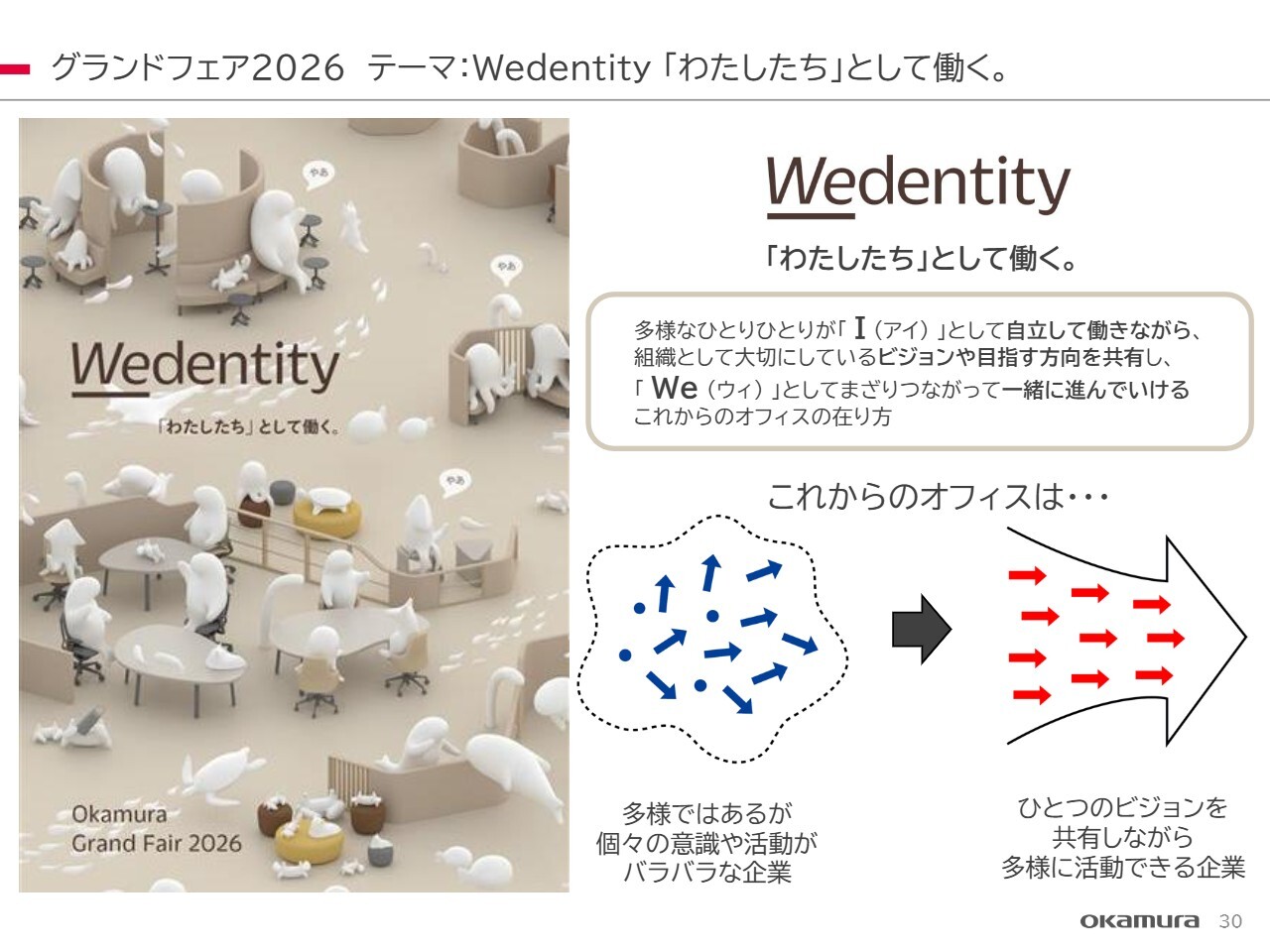 11月12日から新製品発表会「オカムラ グランドフェア2026」を開催します。テーマは「Wedentity(ウィデンティティ)」です。多様な一人ひとりが「I(アイ)」として自立して働きながら、組織として大切にしているビジョンや目指す方向を共有し、「We(ウィ)」としてまざりつながって一緒に進んでいける、これからのオフィスの在り方を提案しています。