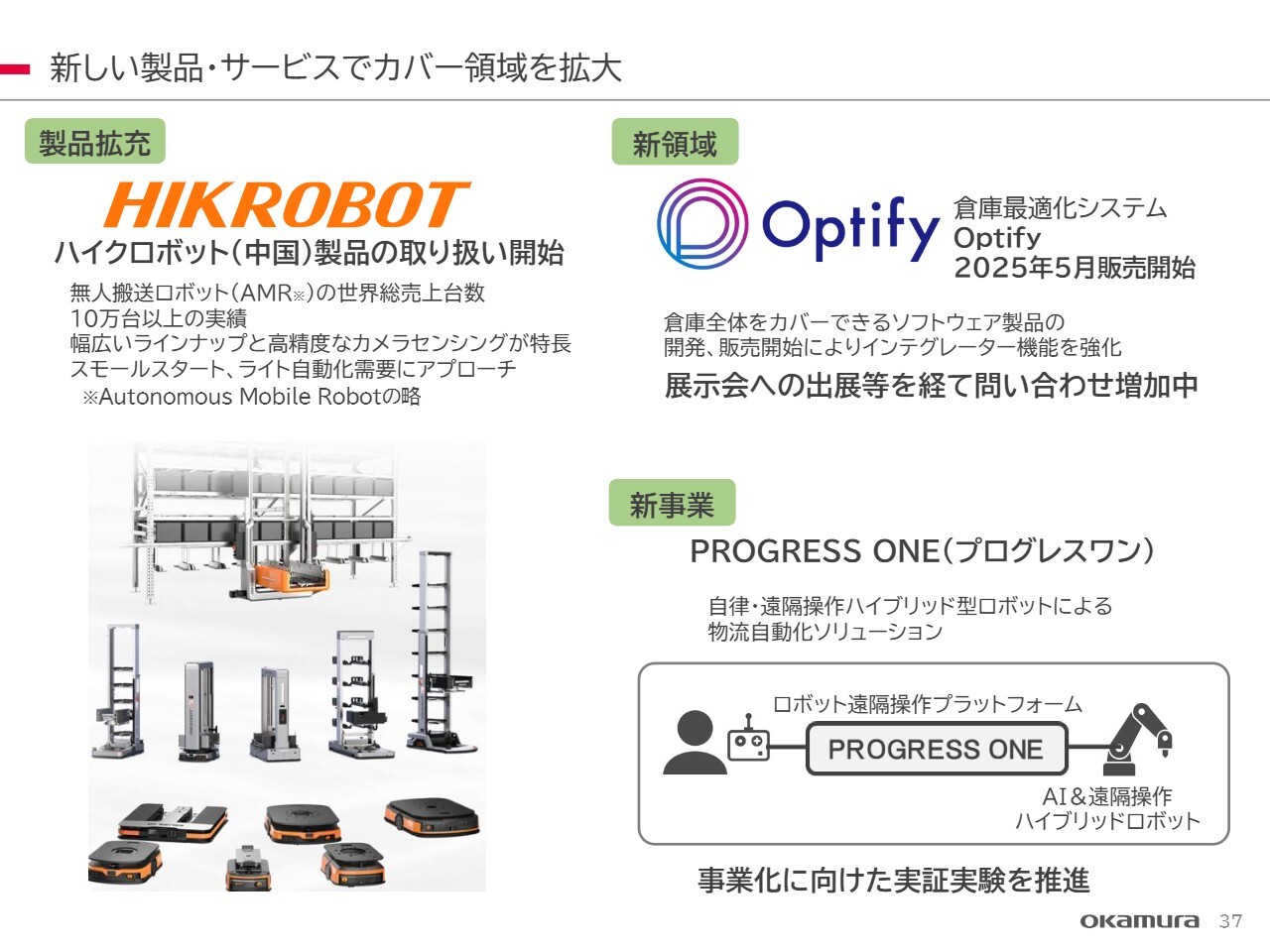また、スライド右上に記載の倉庫最適化システム「Optify(オプティファイ)」についても販売を開始しました。倉庫全体を包括的にカバーするソフトウェア製品の開発・販売開始により、インテグレーター機能を強化しています。展示会に出展したところ、良好な反応を得られています。