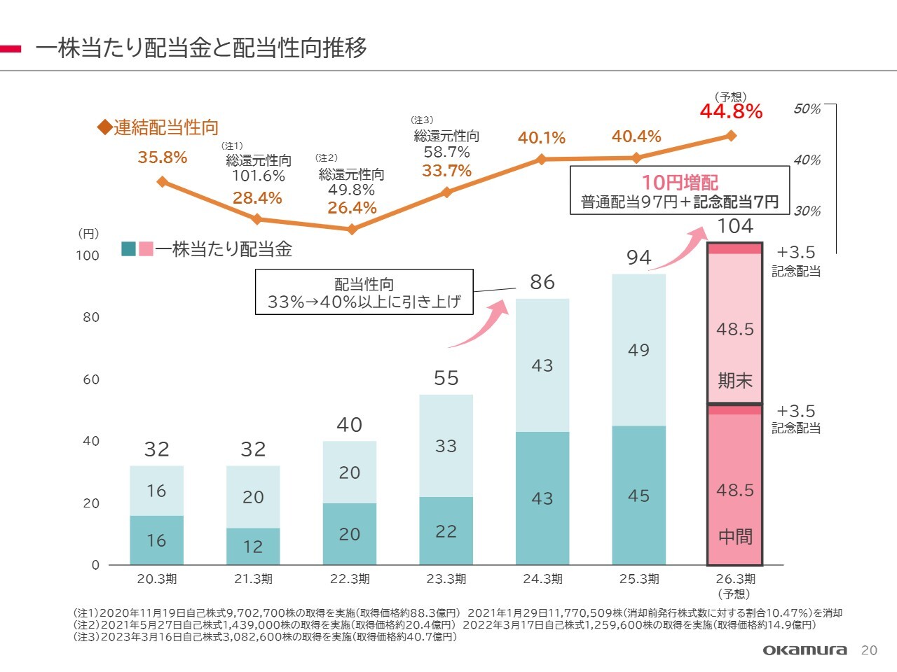 配当についてです。スライド右側に記載のとおり、2026年3月期の予想は、中間配当が52円、期末配当が52円で、年間104円となります。前期より10円の増配を見込んでいます。