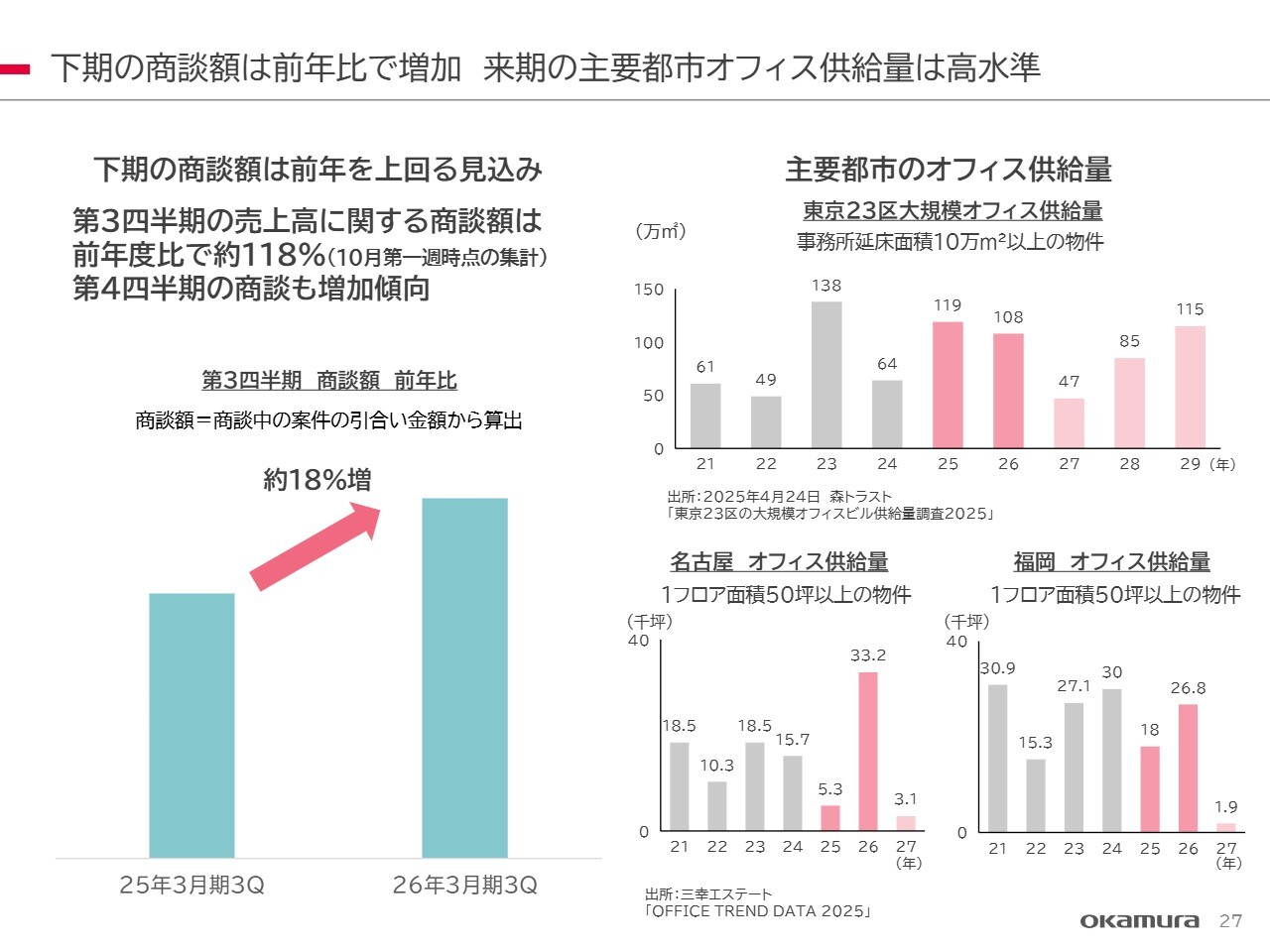 スライド右側には、主要都市である東京23区、名古屋、福岡のオフィス供給量を載せています。2025年、2026年はかなり高水準の新築ビルの竣工が予定されています。