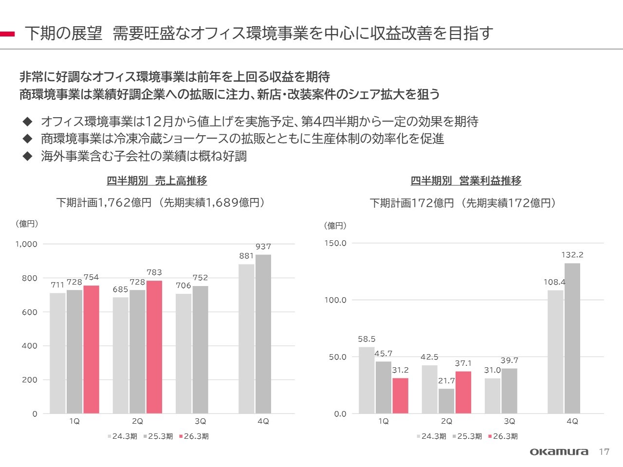 下期の取り組みについてまとめています。オフィス環境事業では、オフィスリニューアル需要を積極的に取り込み、価格改定による利益率の改善に注力します。