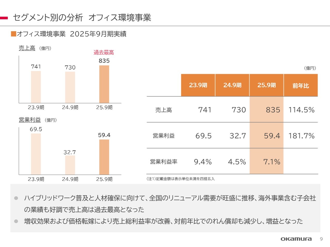 セグメント別の分析です。まず、オフィス環境事業の売上高は過去最高の835億円、営業利益は過去2番目となる59億4,000万円を確保しました。後ほどご説明しますが、このセグメントは全国的にリニューアル需要が旺盛に推移しています。その影響もあり、売上が順調に伸びています。