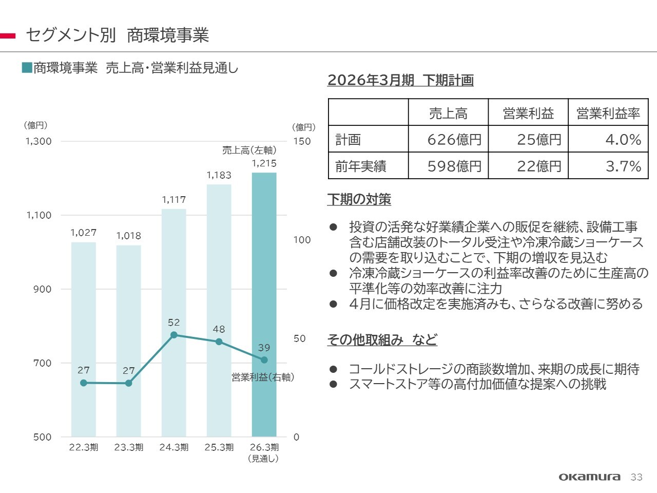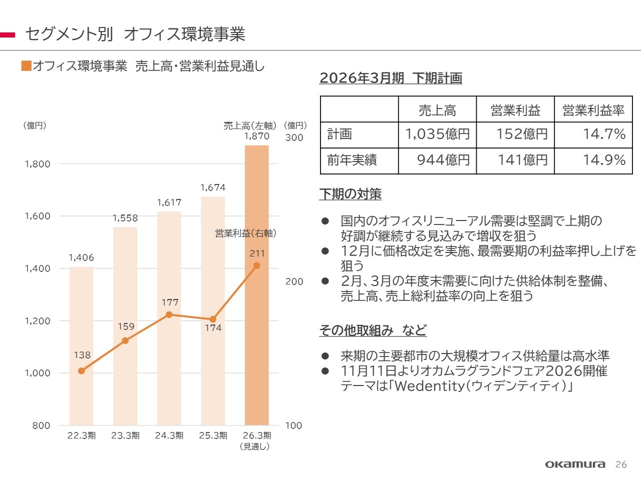 各セグメントの方針についてご説明します。まずはオフィス環境事業です。今期の売上高は1,870億円、営業利益は211億円を目指しています。下期の計画は、スライド右上の表に記載のとおり、売上高は前年の944億円に対して1,035億円、営業利益は前年の141億円に対して152億円を目指しています。