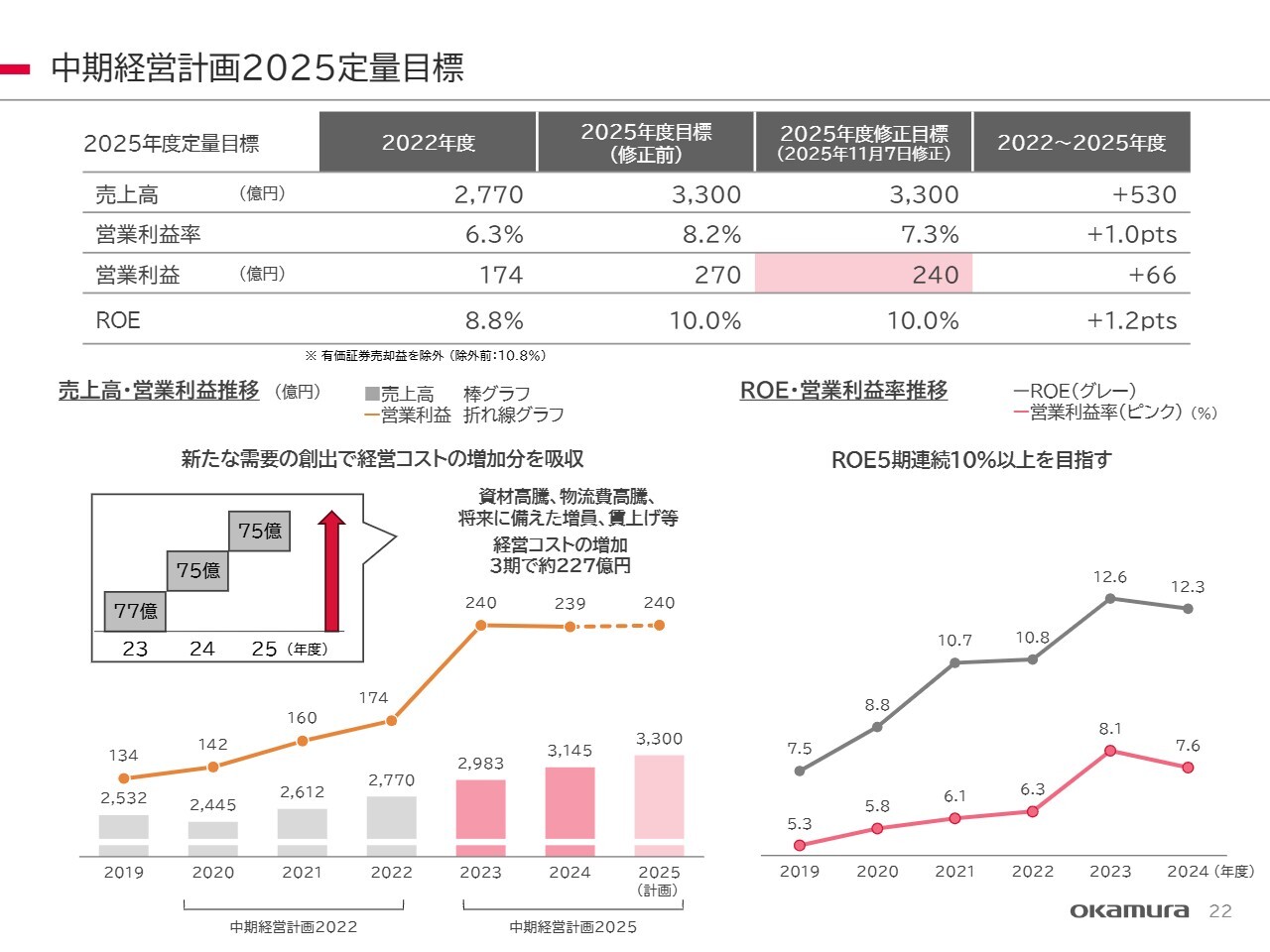 中期経営計画の進捗についてご説明します。今年は「中期経営計画2025」の最終年度にあたります。スライドに、売上高並びに営業利益の直近の業績予想修正を反映した表を掲載しており、売上高は順調に推移しています。