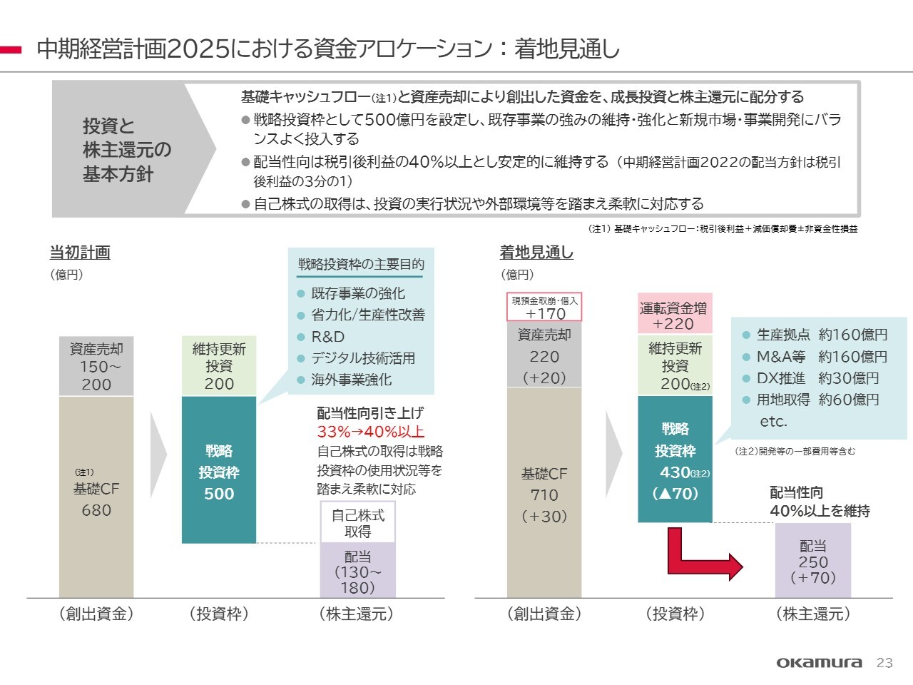 戦略投資についてです。投資枠については、維持更新投資は予定どおり200億円の見込みです。一方、戦略投資枠は当初の500億円に対して70億円減少の430億円を見込んでいます。減少分は配当を増加させるかたちで着地させたいと考えています。