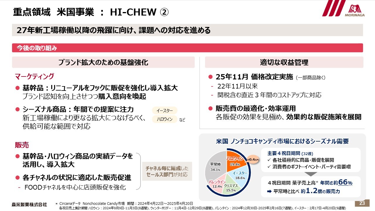 また、エクステンション品のグミ(「HI-CHEW gummies」)は、店頭回転は好調ですが供給量の制限もあり、取り扱いはまだ限定的です。グミはOEM製造ですが、いかにOEMを活用するかが米国事業あるいは海外全体の伸長の肝と考えており、今後体制を整えていきます。