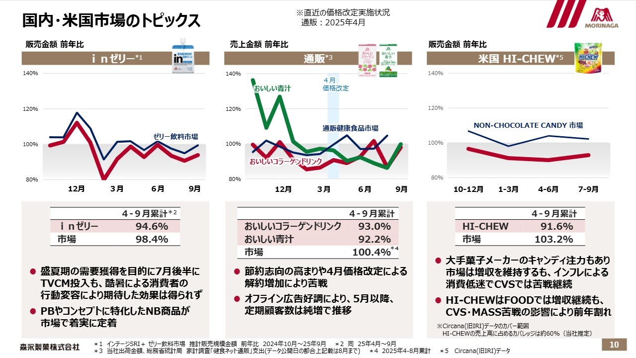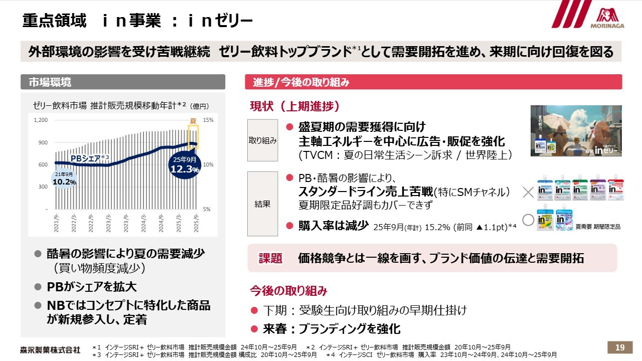 今期の「inゼリー」については、夏場の日常生活における飲用シーンを想定した新たなコマーシャルの投入や、東京2025世界陸上への協賛など、夏場の需要獲得に向けて広告・販促強化に取り組みましたが、残念ながらその効果は薄いという結果となりました。