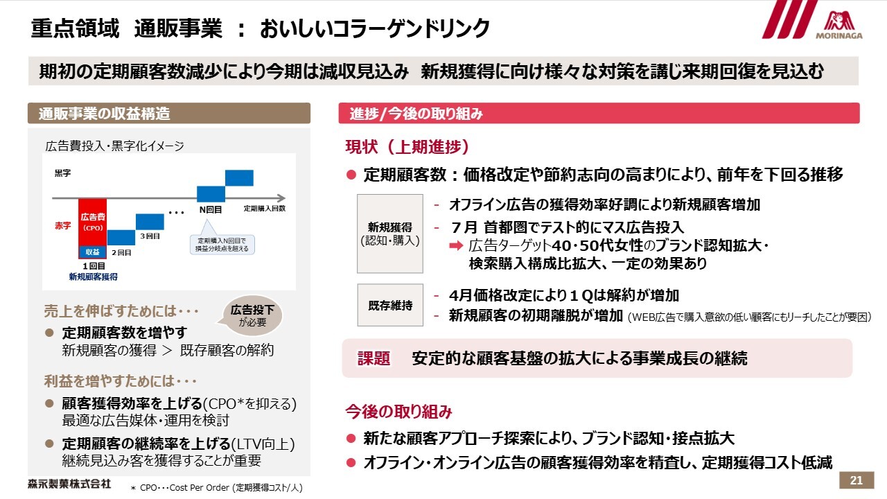 通販事業についてです。先ほども触れましたように、今期は期首時点の定期顧客数の減少により減収を見込んでいます。あらためて、スライドの左側に通販事業の収益構造を示しましたが、売上を伸ばすためには、新規定期顧客獲得数が既存の定期顧客数の解約数を上回りつつ、全体の定期顧客数が増えることが必要です。