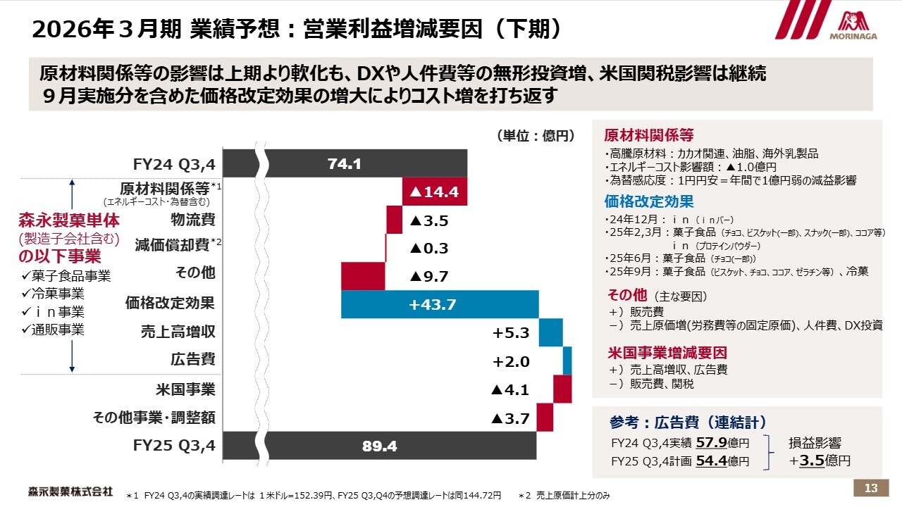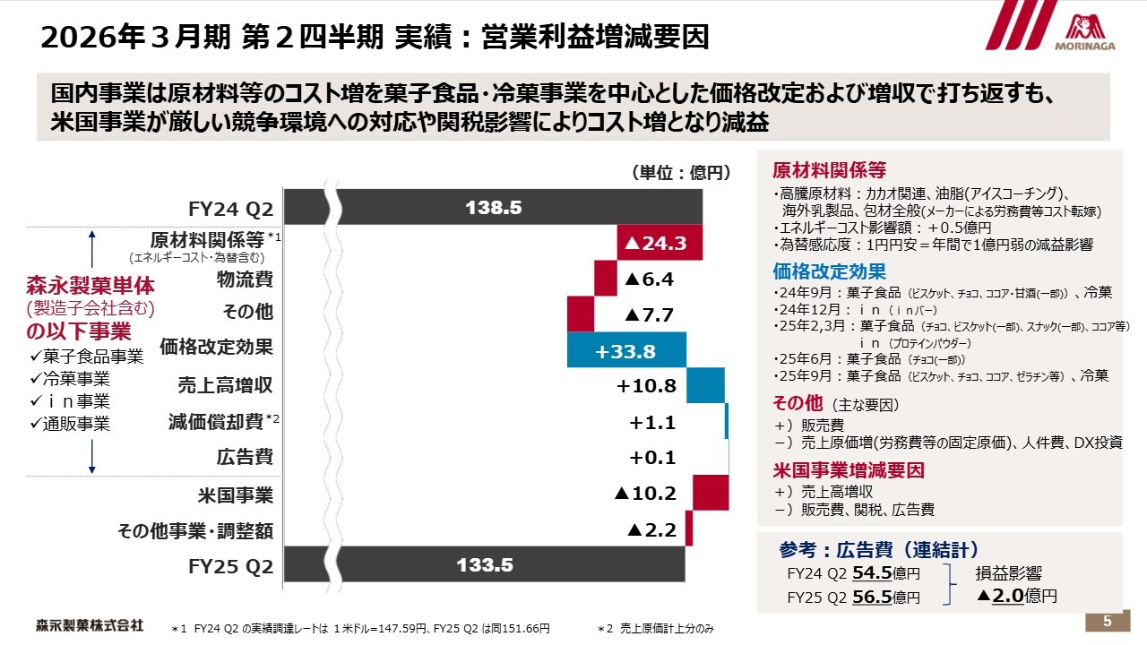 まず、国内4事業における為替、エネルギーコストを含めた原材料関係では、前年と比較して24億3,000万円のマイナス影響となりました。この主な要因は、カカオ関連の原料費の上昇が大きく占めている状況です。