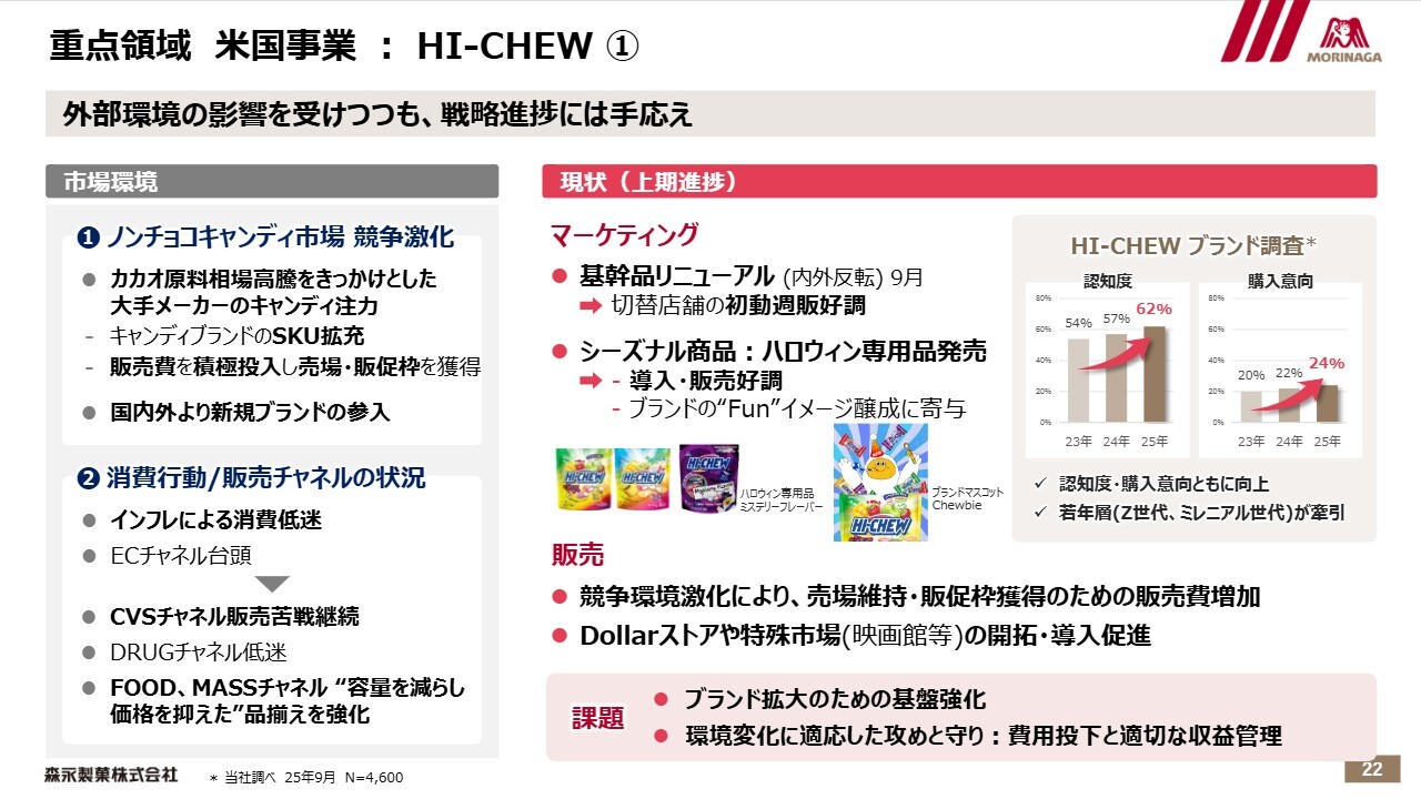 次に、米国事業の「HI-CHEW」についてお話しします。市場環境についてあらためてお伝えすると、ノンチョコキャンディ市場では、大手菓子メーカーのキャンディシフトによってキャンディブランドのSKUが拡充され、競争が激化しています。また、インフレによる消費者全体の消費減退を受け、安価なPBが積極的に展開されています。