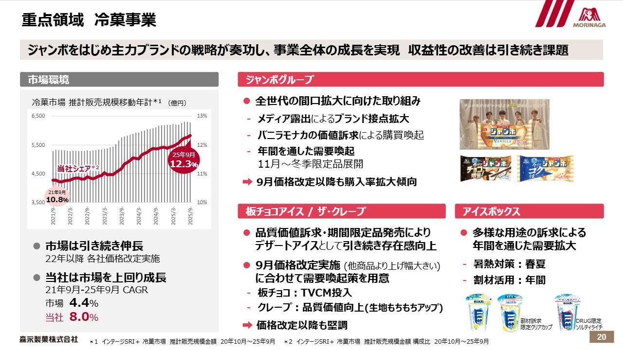 また、「アイスボックス」も年間で拡大しています。ここには記載していませんが、「ビスケットサンド」や「パリパリサンド」といった、当社が得意とする冷凍菓子技術を活用した次の主要商品候補も順調に育成されています。課題としては収益性の改善がありますが、重点領域としてはこうした背景から順調に推移するものと想定しています。