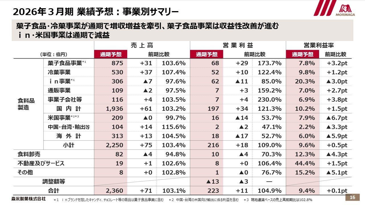 通期業績予想を事業別にまとめたサマリーです。大きな捉え方としては、菓子食品事業と冷菓事業の増益効果で、in事業や米国事業の減益を補う構図になっています。