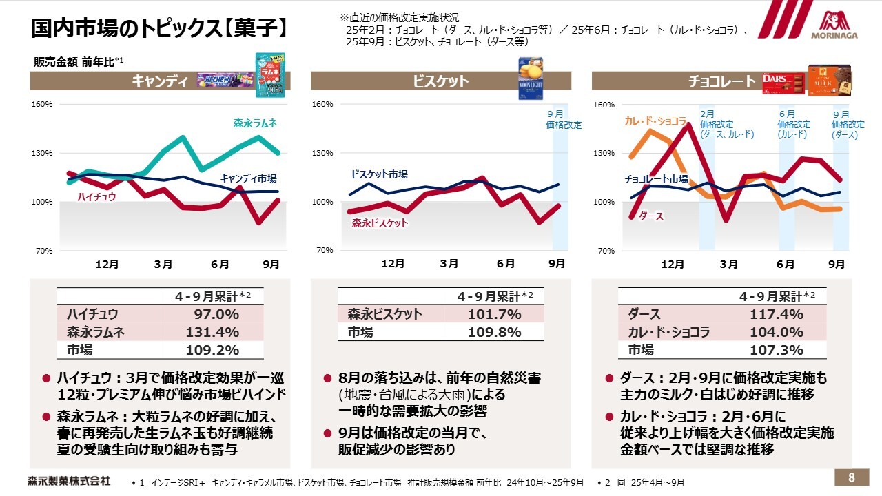 一方、「森永ラムネ」は「大粒ラムネ」の好調継続に加え、春に再発売した「生ラムネ玉」の拡大もあり、131.4パーセントと好調に推移しました。当社のキャンディ全体としては108.5パーセントと伸長しており、キャンディシフト戦略は順調に推移しているといえます。