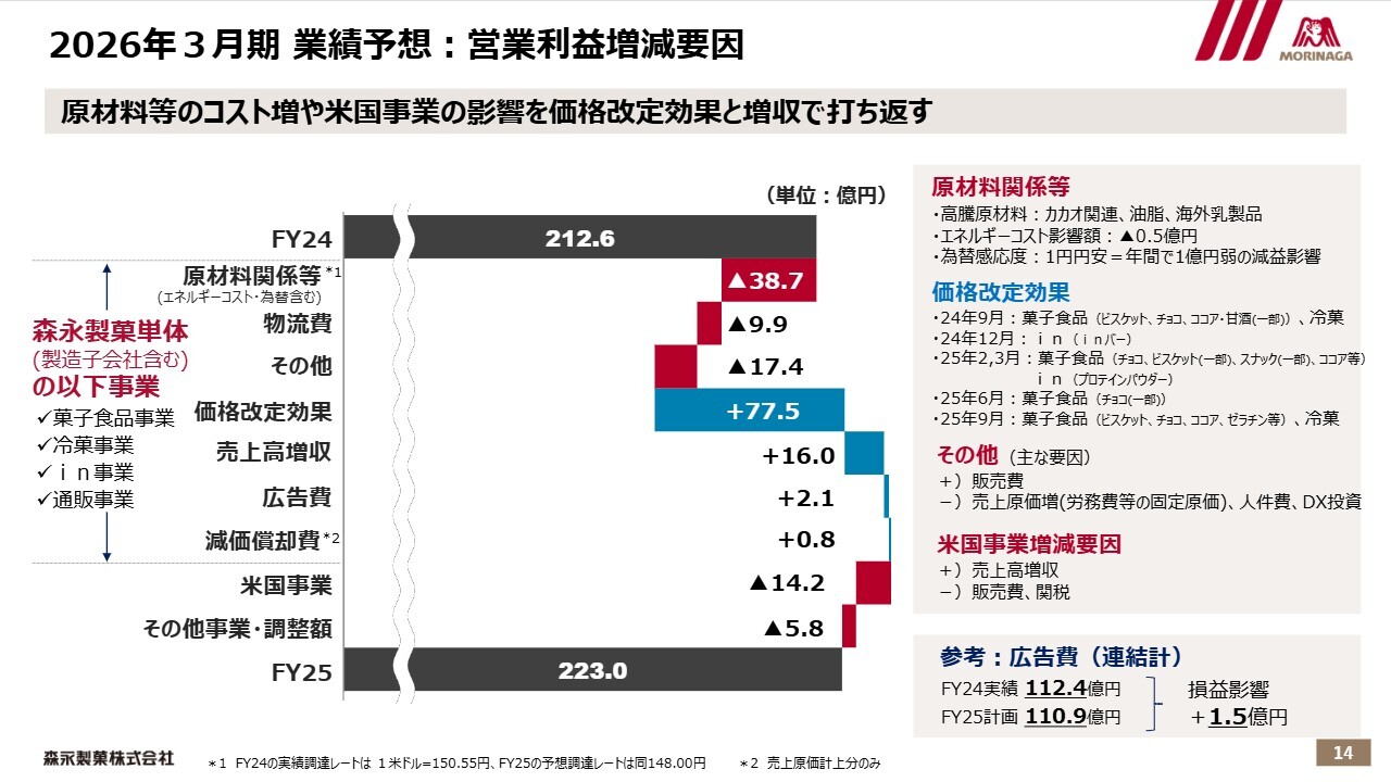 年間で見ると、原材料関係が約39億円増加しています。また、その他に含まれる人材投資やDX投資といった無形投資の増加、物流費の増加、さらに米国事業の減益を含めると、約80億円の減益要因があります。