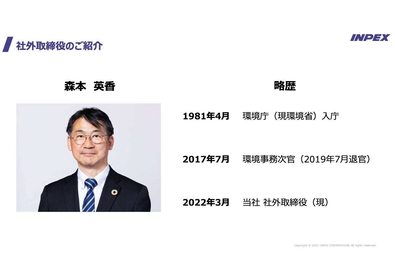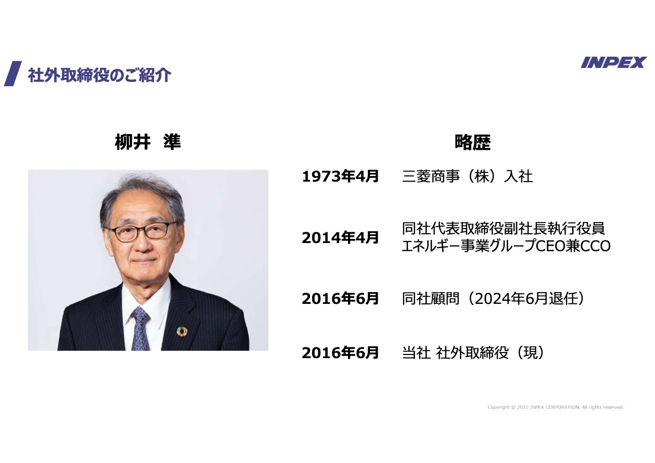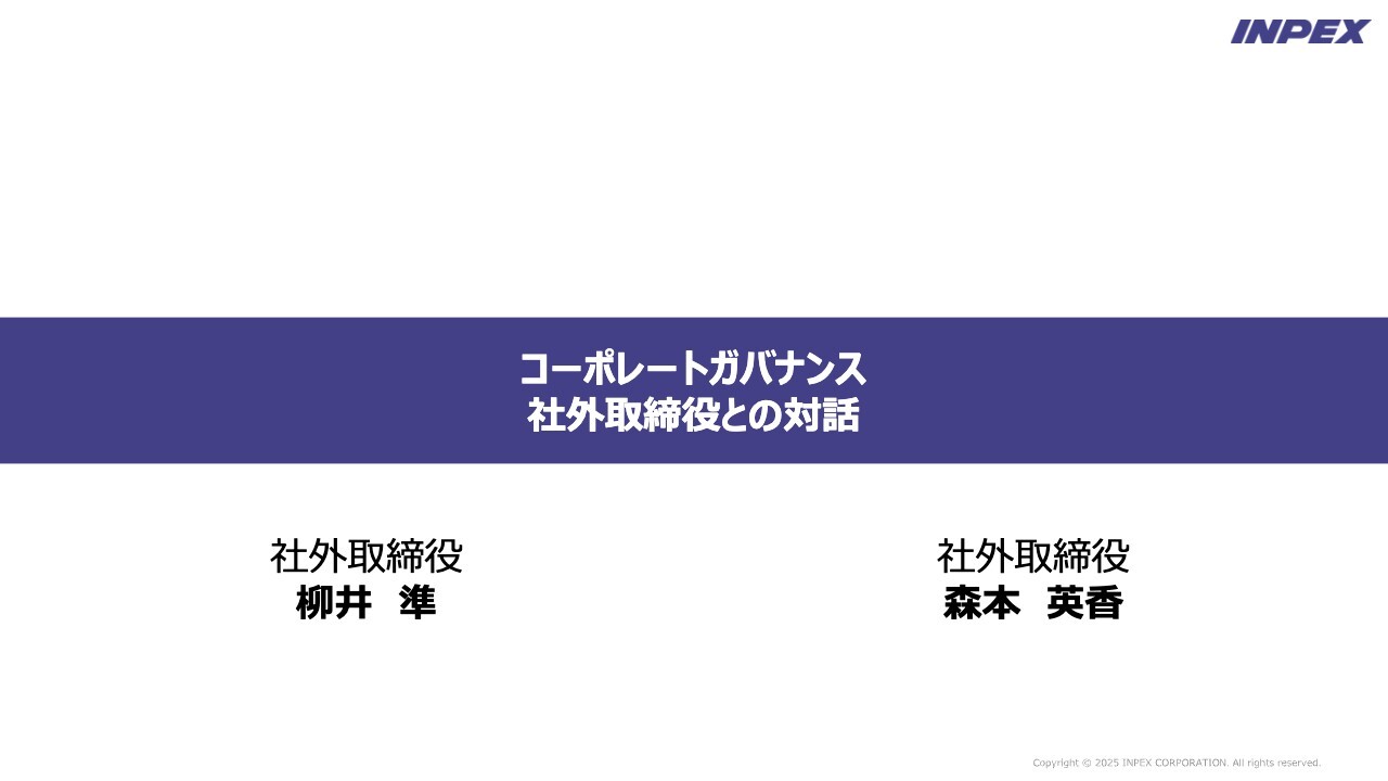 前半は社外取締役の柳井準さま、森本英香さまより、これまでガバナンスの観点で果たしてこられた役割、そして今後のINPEXの成長への期待についてお話をうかがいます。後半では、みなさまからの質問を受け付けますので、どうぞよろしくお願いします。