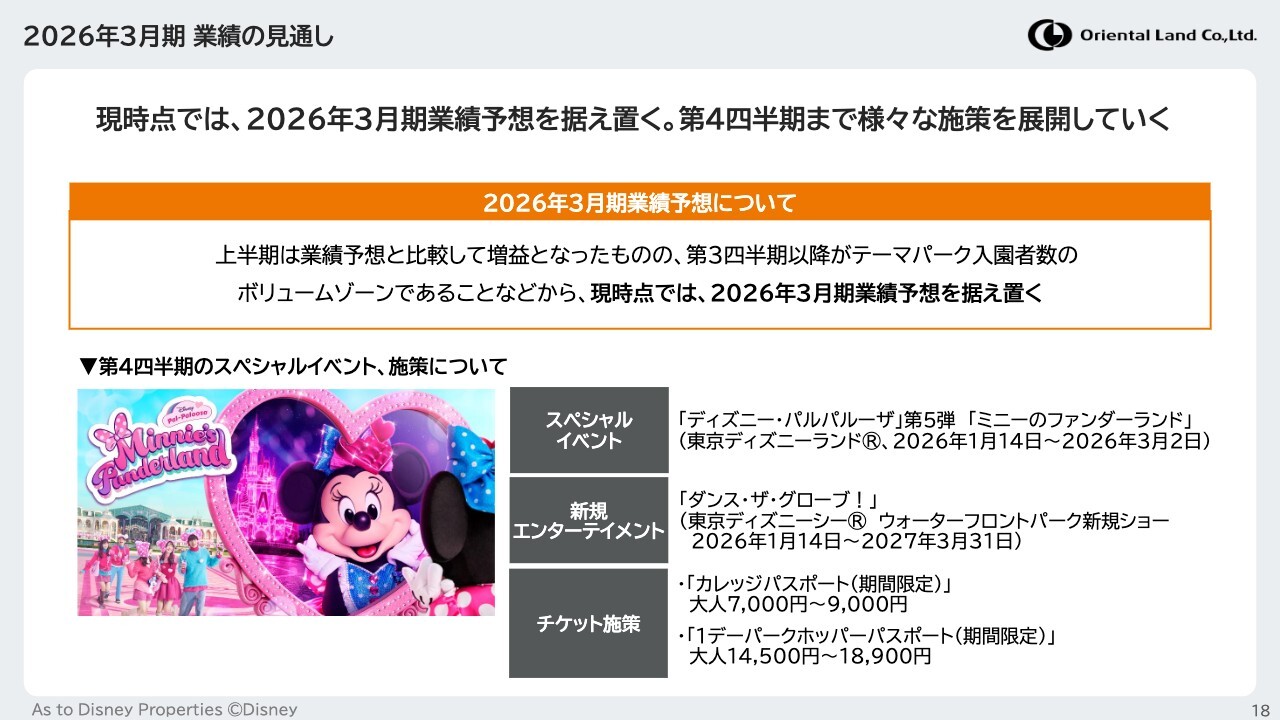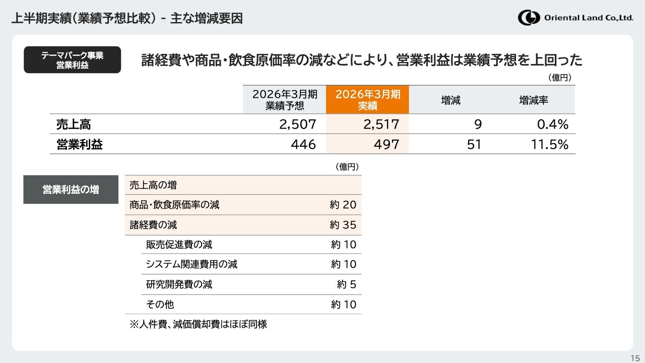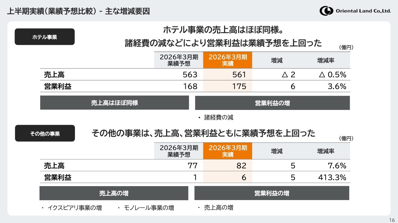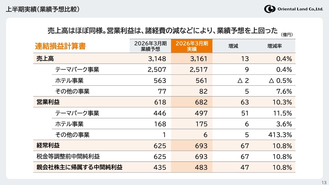 上半期は業績予想と比較して増益となりました。ただし、第3四半期以降はテーマパークの入園者数のボリュームゾーンに該当することや、上半期の増益要因の1つが諸経費の時期ずれであることから、現時点では2026年3月期業績予想を据え置く判断をしました。