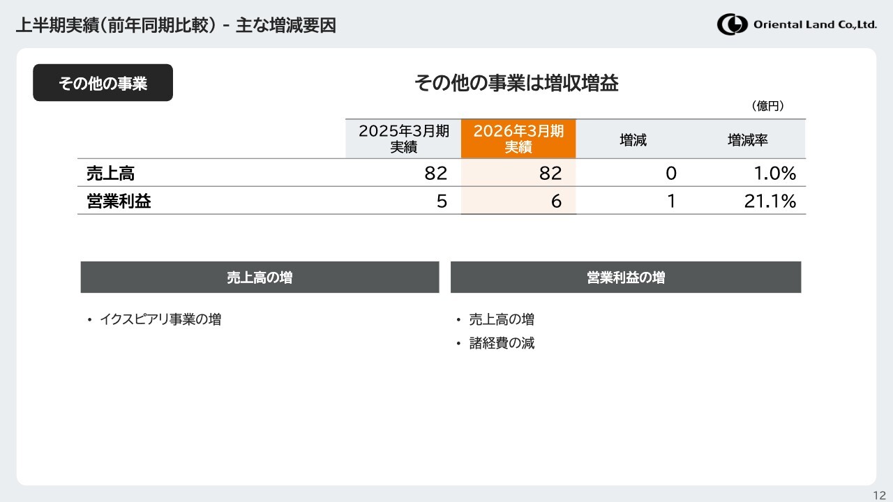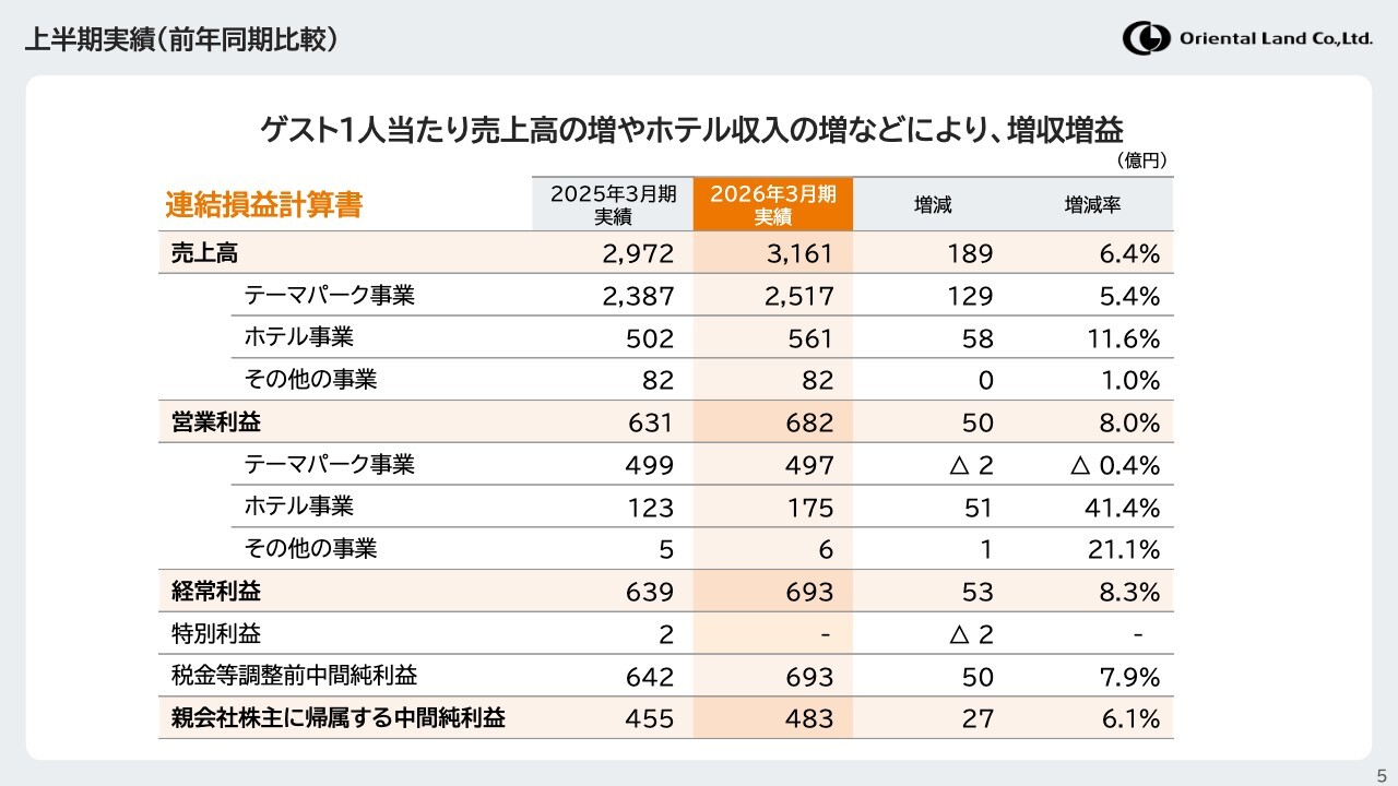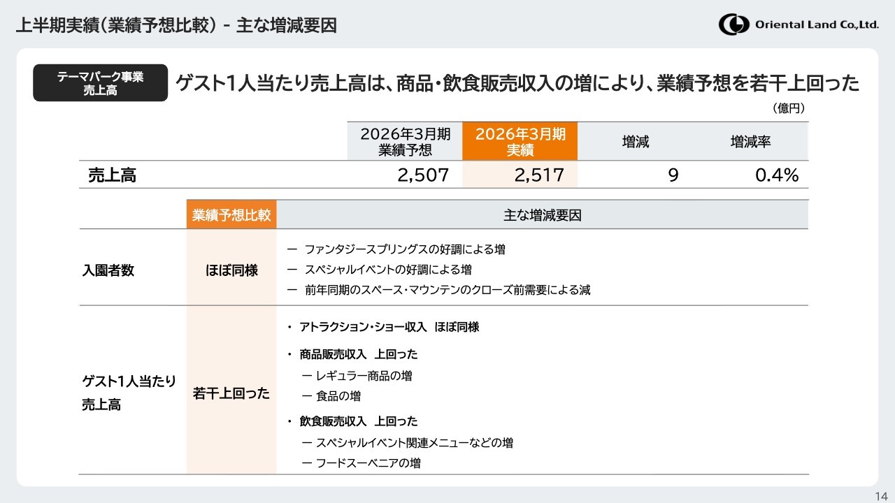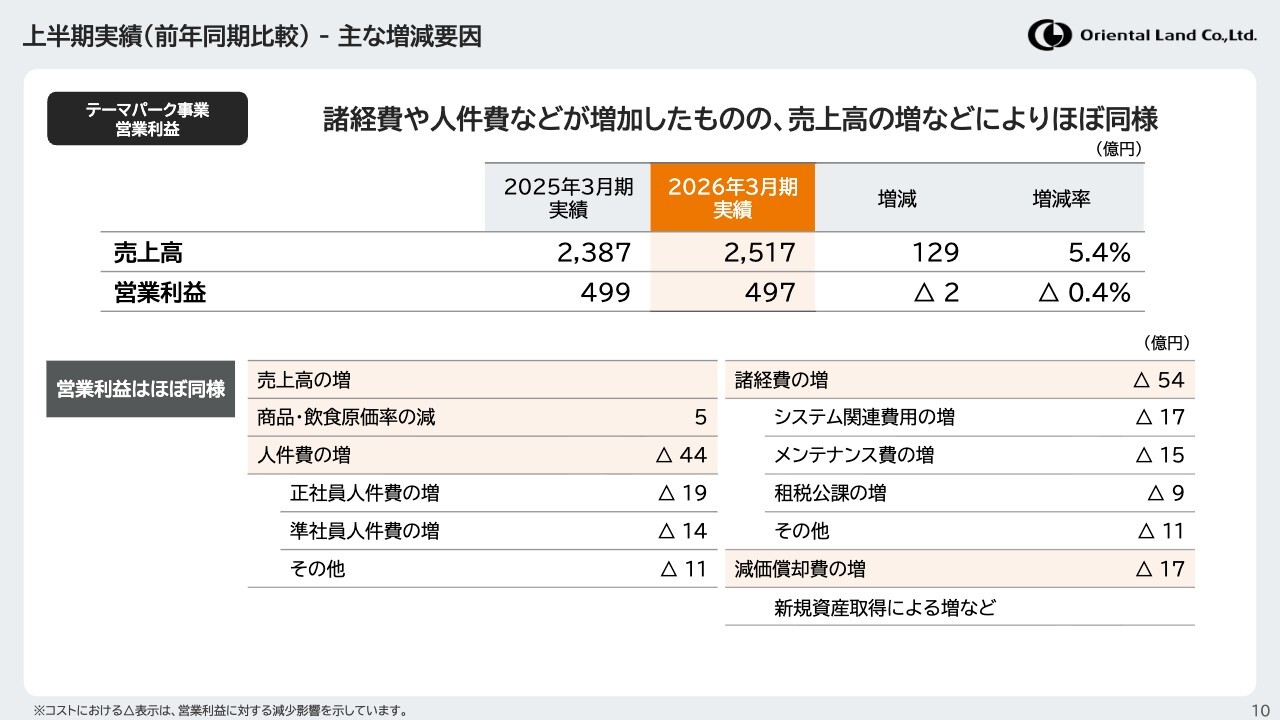 上半期は業績予想と比較して増益となりました。ただし、第3四半期以降はテーマパークの入園者数のボリュームゾーンに該当することや、上半期の増益要因の1つが諸経費の時期ずれであることから、現時点では2026年3月期業績予想を据え置く判断をしました。
