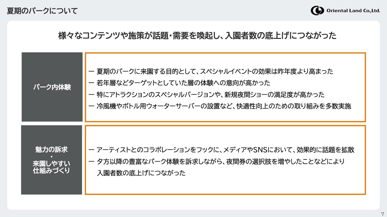 前期の猛暑を受け、今期は夏期の需要を喚起できるよう準備を重ねてきました。ターゲットを絞り、そのターゲットに響くコンテンツや施策を導入するとともに、パークの魅力を訴求しながら、来園しやすい仕組み作りを整備することを方針として、スペシャルイベント「サマー・クールオフat Tokyo Disney Resort」を展開しました。