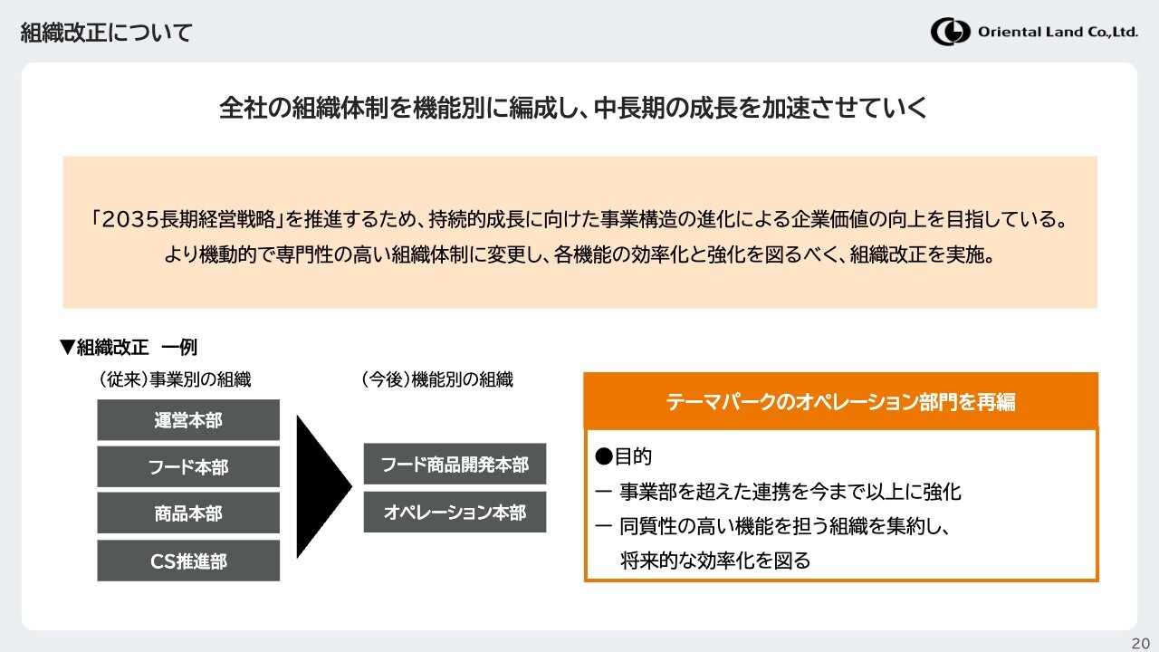例えば、従来はアトラクションやパーク運営を管轄する運営本部、フード本部、商品本部など、事業別に分かれていた組織を、統合して、フード商品開発本部とオペレーション本部に再編します。