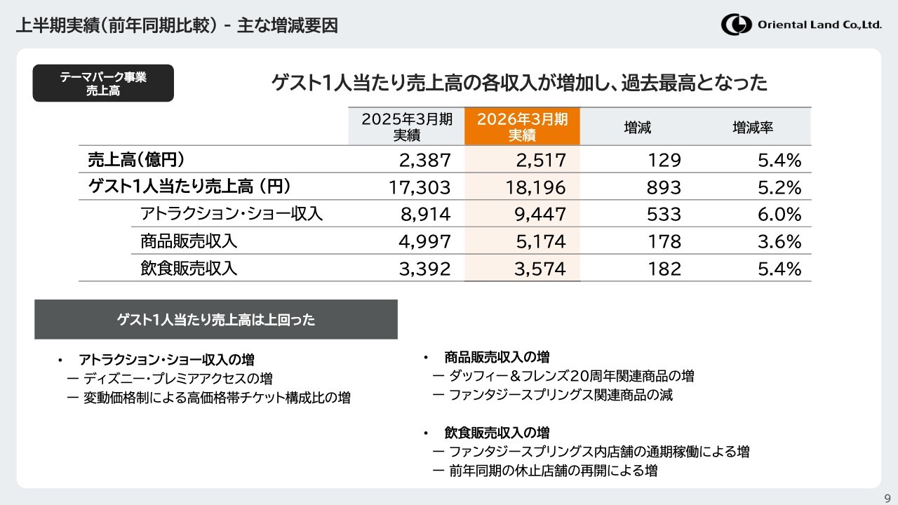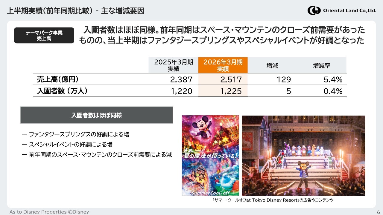 前年同期はスペース・マウンテンのクローズ前需要による減少がありましたが、当上半期はファンタジースプリングスやスペシャルイベントが好調でした。