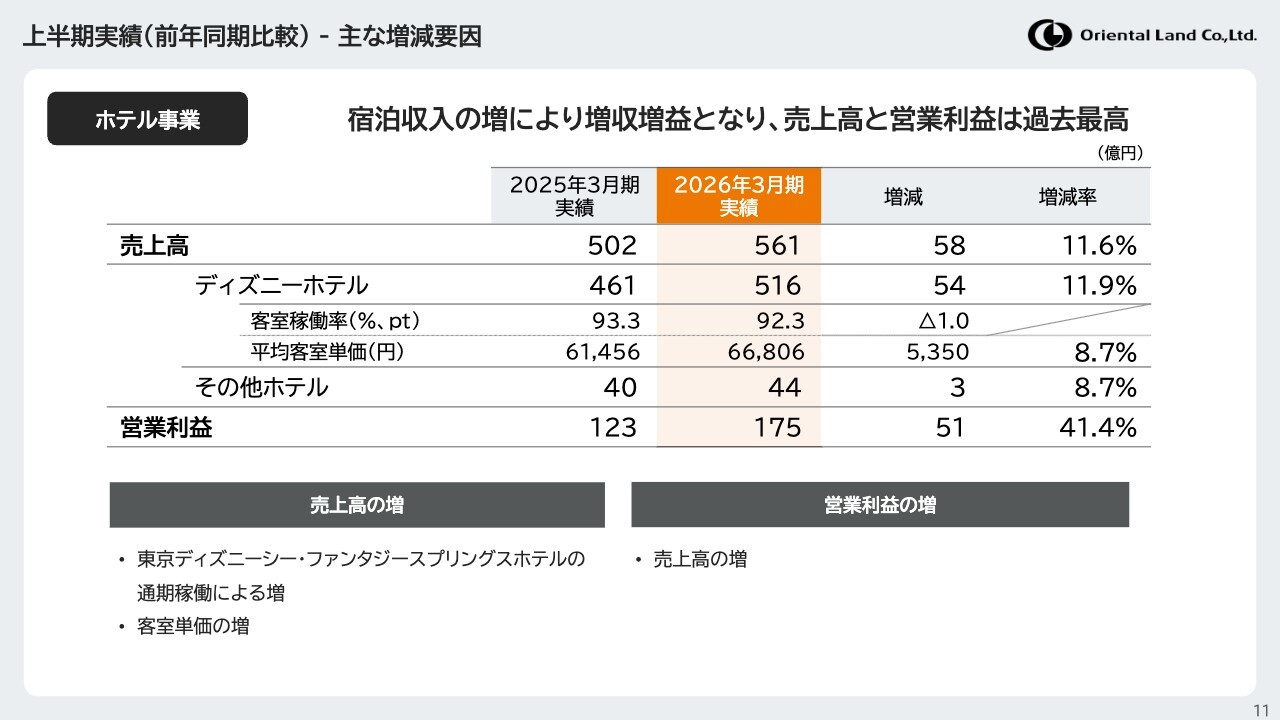 ホテル事業では、東京ディズニーシー・ファンタジースプリングスホテルの宿泊収入や客室単価の増加により、売上高は前年同期比58億円増の561億円となりました。