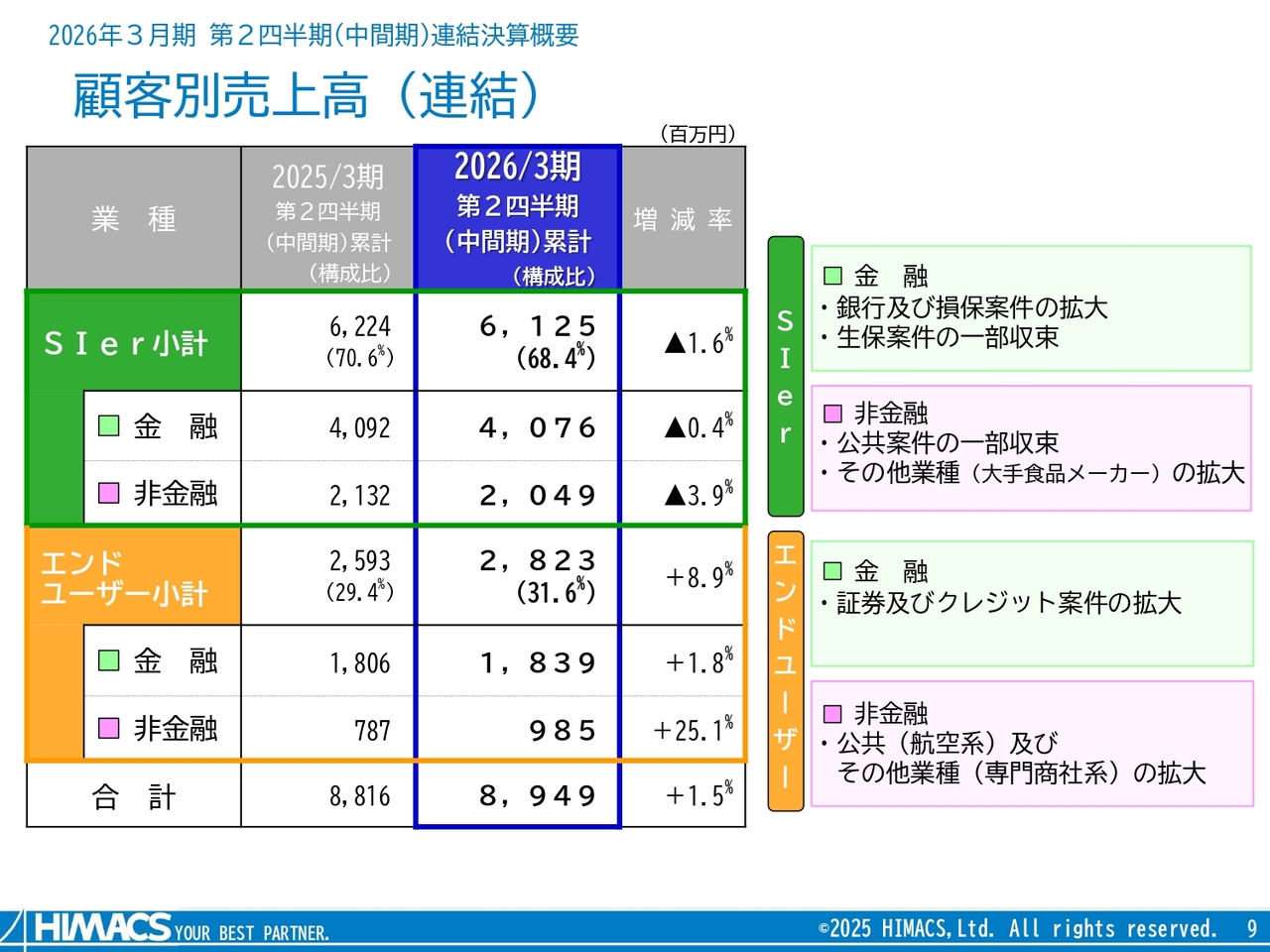 次に、エンドユーザー向けの取引は前期比8.9パーセント増加し、売上高構成比は31.6パーセントとなりました。金融向けでは証券及びクレジット、非金融向けでは航空系や専門商社系の案件が拡大しました。