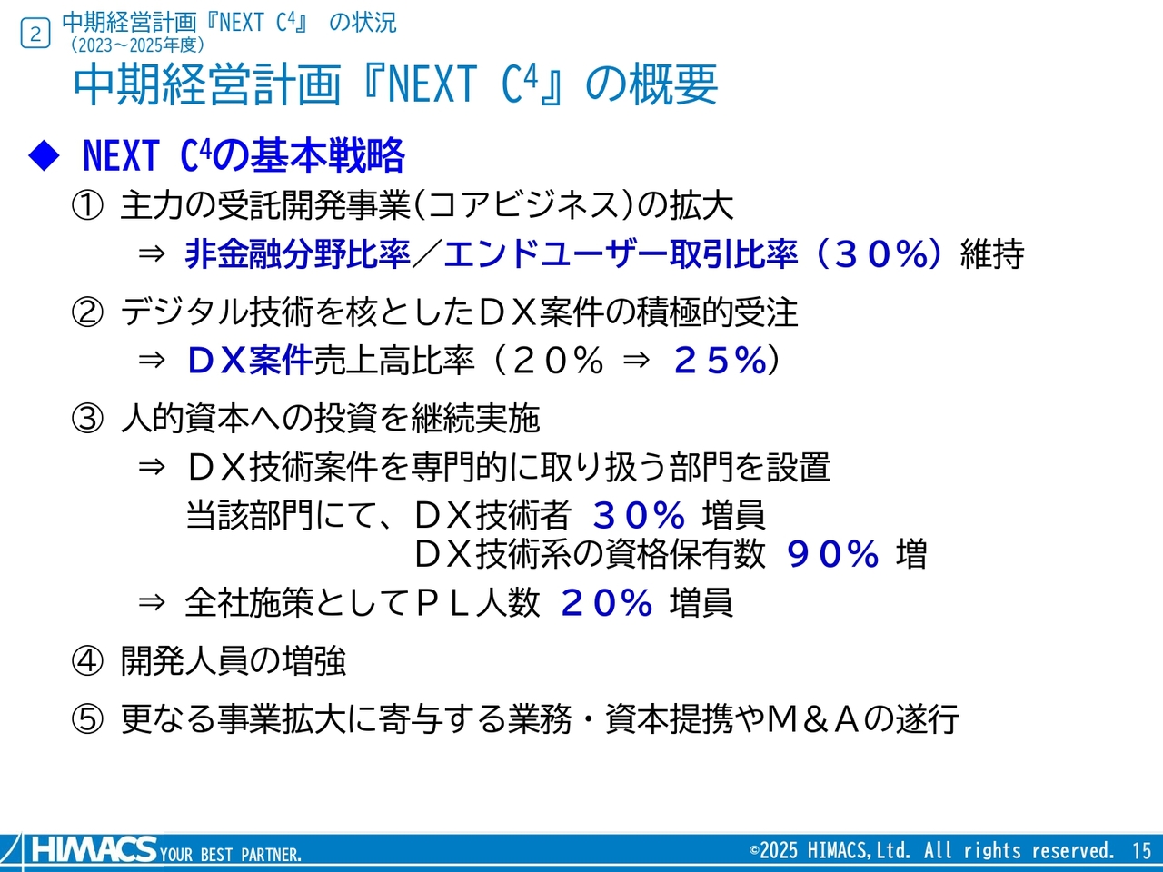 「NEXT C4」の基本戦略です。主力である受託開発事業の拡大においては、非金融分野及びエンドユーザー取引の比率30パーセントを維持する方針です。