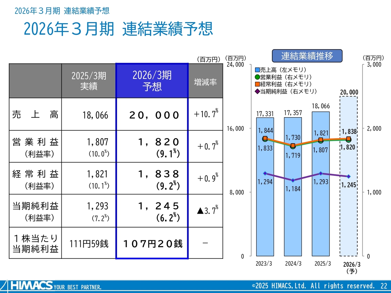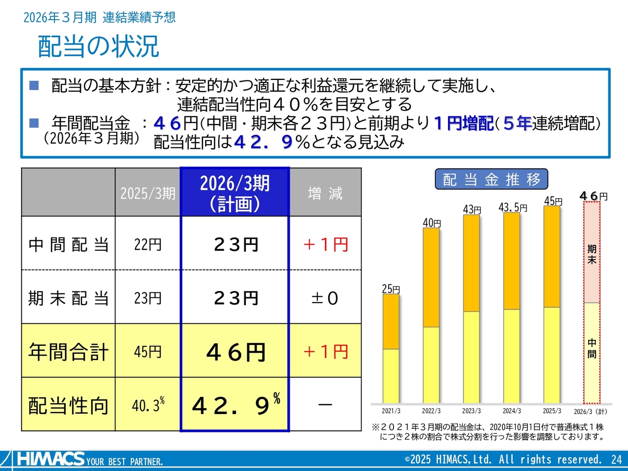 2026年3月期は、1株につき46円とし、前期比で1円増配し、5年連続の増配を計画しています。通期業績予想に基づく配当性向は42.9パーセントとなる見込みです。今後もこの基本方針に基づき、安定的かつ適正な利益還元を継続していきます。