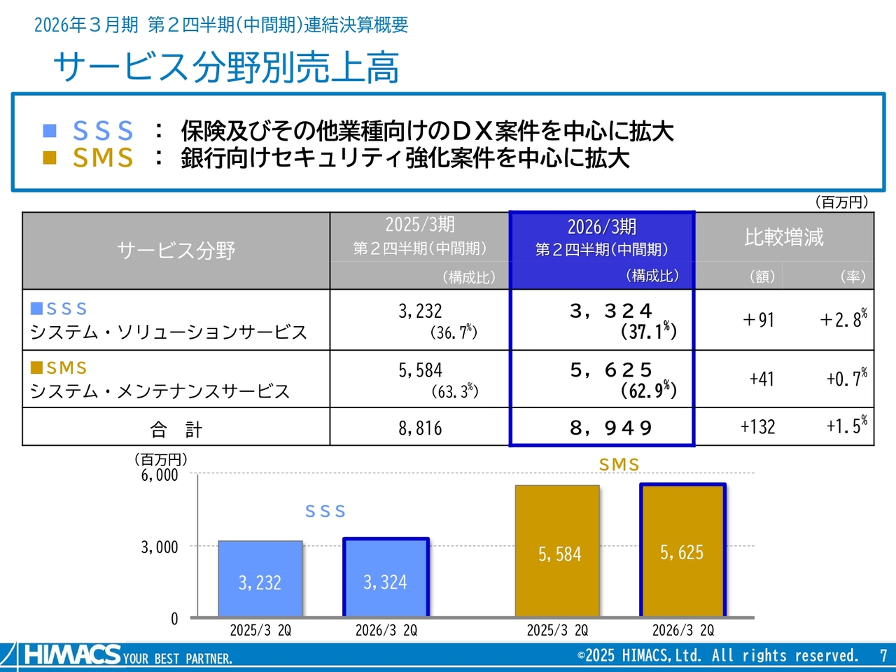 システム・メンテナンスサービス(SMS)は、銀行向けセキュリティ強化案件を中心に拡大し、56億2,500万円で、前期比で4,100万円増加しました。