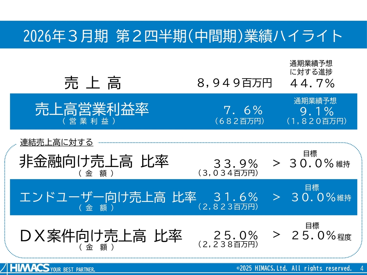 中島太氏:みなさま、こんにちは。株式会社ハイマックス代表取締役社長の中島です。当社の2026年3月期第2四半期の決算説明動画をご覧いただき、ありがとうございます。