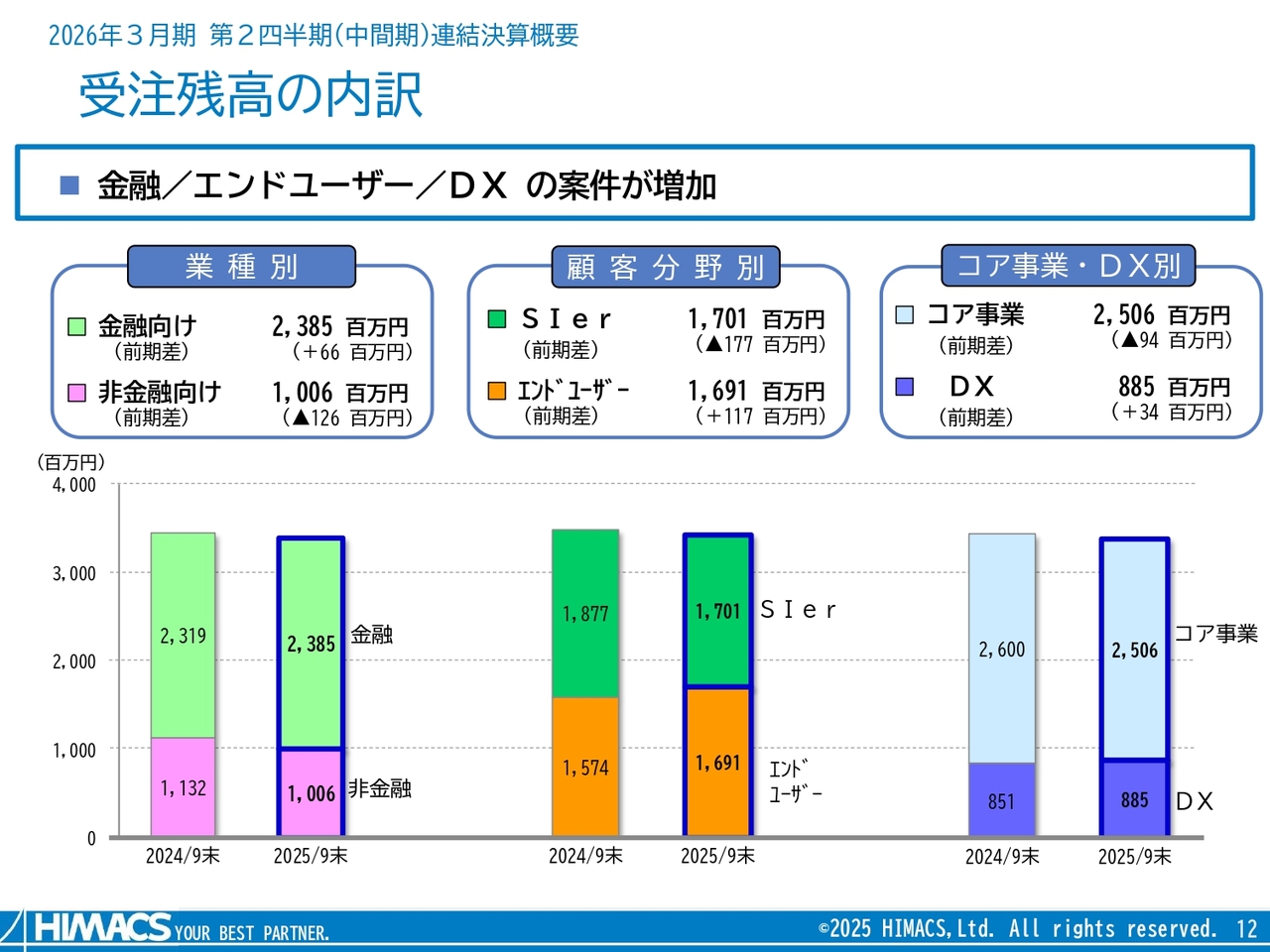 受注残高の内訳については、金融、エンドユーザー、DXの案件が増加しています。