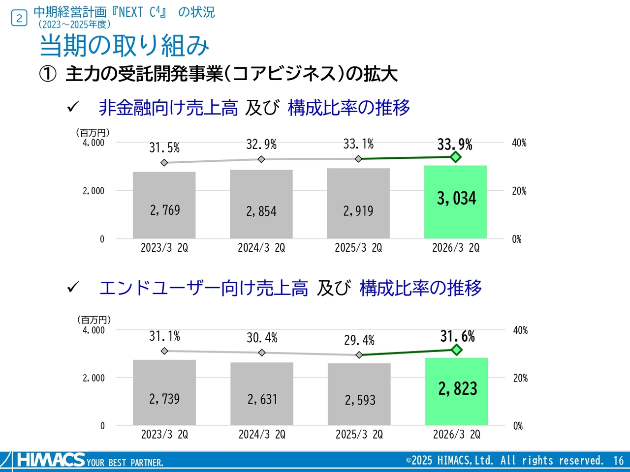 それぞれの比率はスライドのとおり目標を達成しており、引き続き業績拡大に向けて注力していきます。