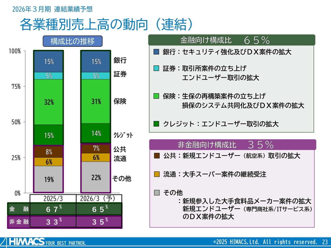 売上高の構成比率は、金融向けが65パーセント、非金融向けが35パーセントと見込んでいます。