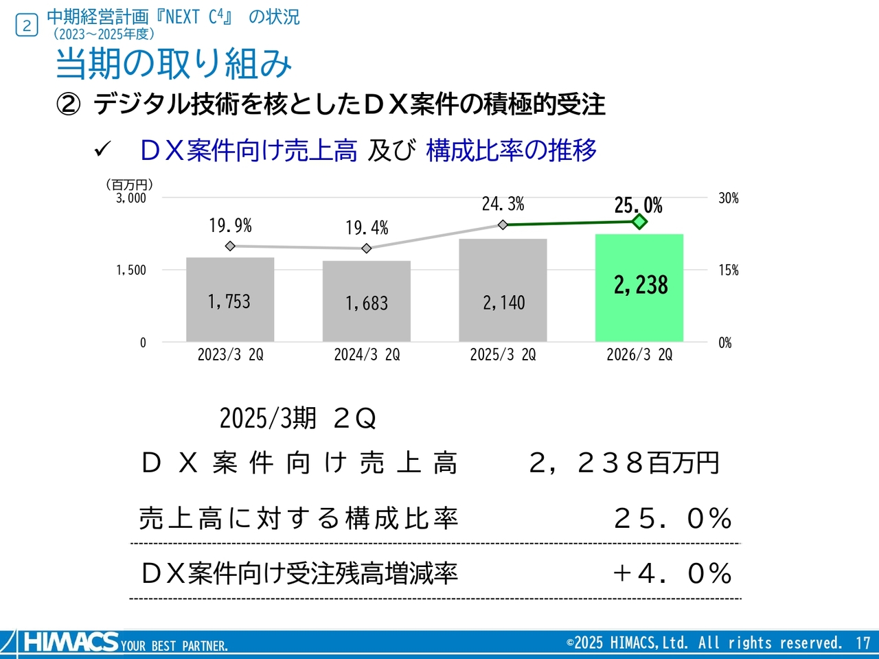 DX案件については、連結売上高の25.0パーセント程度まで高めていきます。当期の実績は22億3,800万円で、構成比は25.0パーセントとなりました。DX案件向け受注残は前期比で4.0パーセント増となっています。