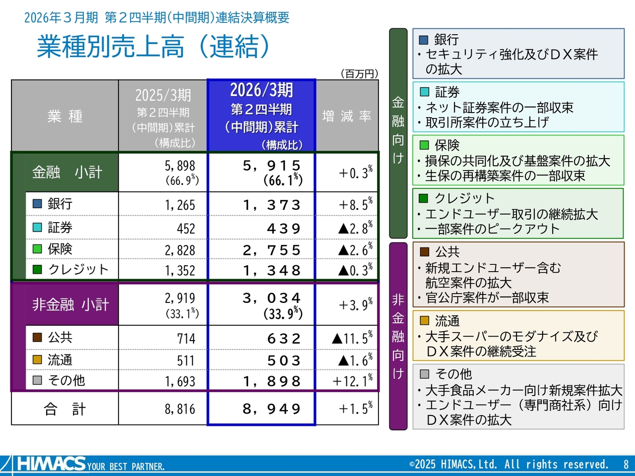 金融・非金融の売上高の内訳です。全般的にエンドユーザー取引の開拓や新規プロジェクトの立ち上げに注力しました。特に、金融では銀行のセキュリティ強化やDX案件が拡大し、非金融では大手食品メーカーの新規案件や専門商社系エンドユーザー向けDX案件が拡大しました。