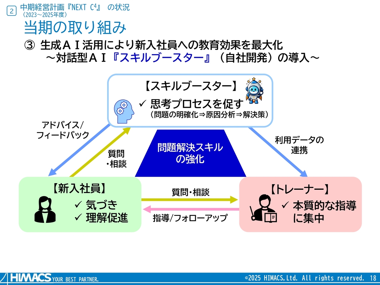 生成AIの活用にも取り組んでいます。新入社員教育では、対話型AI「スキルブースター」を自社開発し、導入しました。